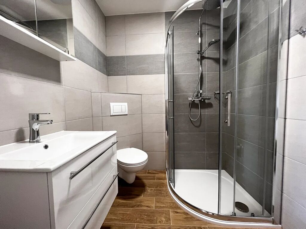 • moderní koupelna se sprchovým koutem, umyvadlovou skříňkou a toaletou