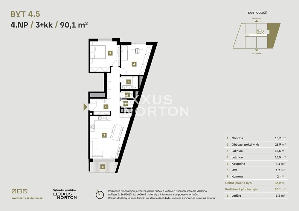 Nabízíme moderní byt 3+kk o celkové ploše 90,1 m², který se nachází ve 4. nadzemním podlaží prestižního projektu ZEN Rezidence v pražské Libni. Tento byt s lodžií (5,3 m²) orientovanou na jihozápadní stranu a promyšlenou dispozicí nabízí ideální spojení pohodlí, funkčnosti a stylového bydlení v blízkosti centra města.