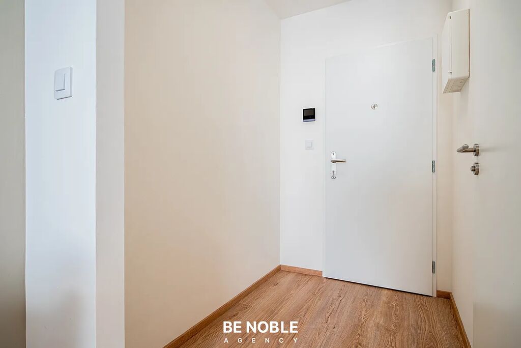 Byt je plně vybavený a připravený k okamžitému nastěhování. Součástí je moderní vestavěná kuchyňská linka s dostatkem úložných prostor, varnou deskou, lednicí, vestavěnou digestoří a mikrovlnnou troubou. Obytná část je zařízena kvalitní rozkládací pohovkou, komodou a jídelním stolem pro dvě osoby. Závěsy, záclony a designová svítidla dotvářejí příjemnou atmosféru. V předsíni před předáním proběhne instalace úložných prostor. Velké okno, kterým proudí spousta světla, a výhled do klidného zeleného vnitrobloku z 5. patra. Koupelna se sprchovým koutem, záchodem, pračkou a umyvadlem. Pod umyvadlem je úložný prostor.