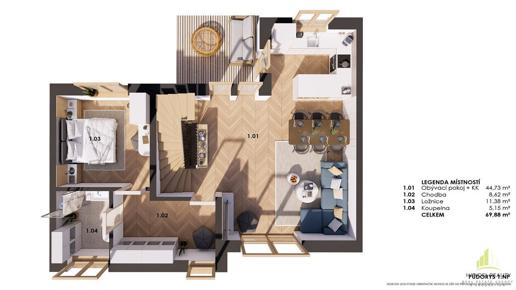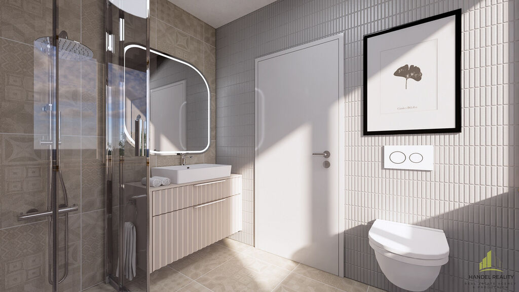 2. NP tvoří prostorný obývací pokoj propojený s kuchyní, ložnice a koupelna se sprchovým koutem.