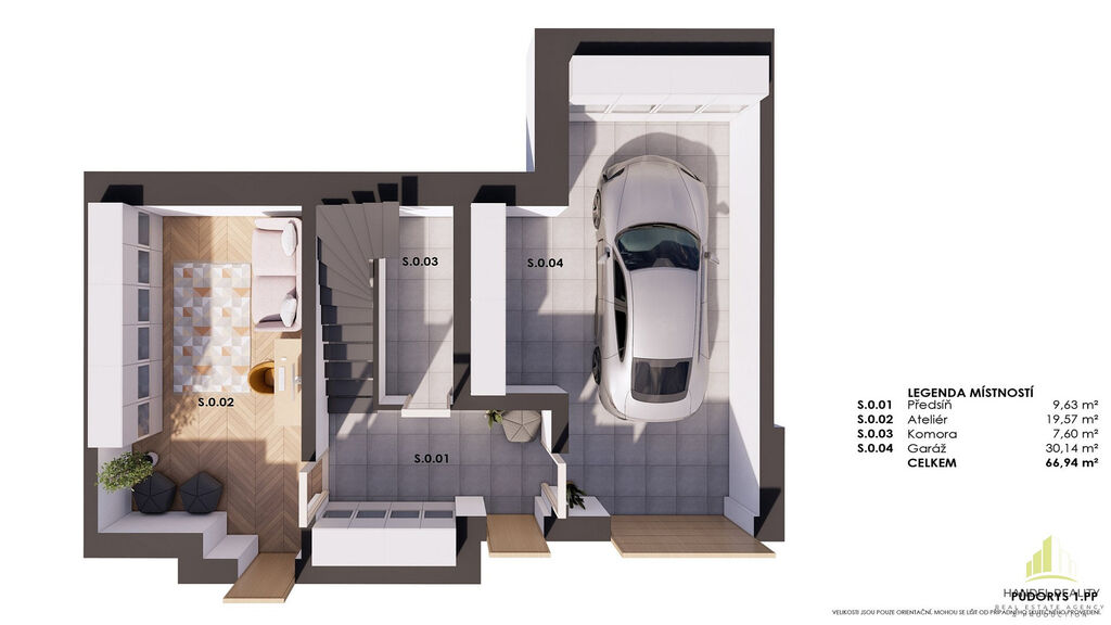 V přízemí ze vstupní chodby se nachází vstup do garáže s technickým zákoutím a vstup do ateliéru.