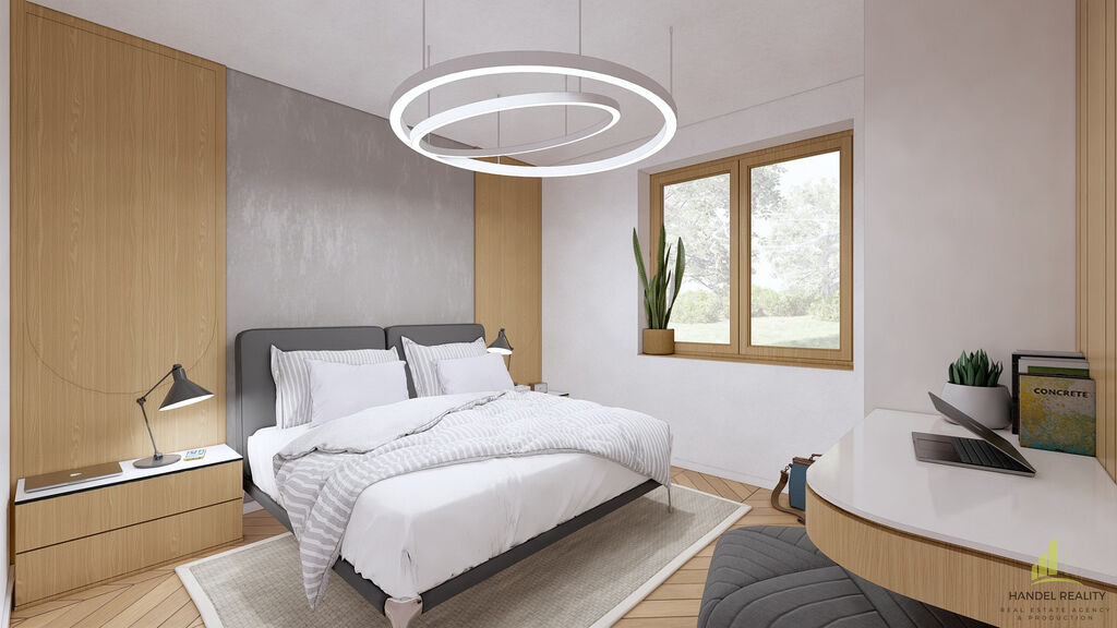 Interiér působí velmi vzdušně a prosvětleně. Obývací pokoj je od ložnice a koupelny oddělený prostornou chodbou.