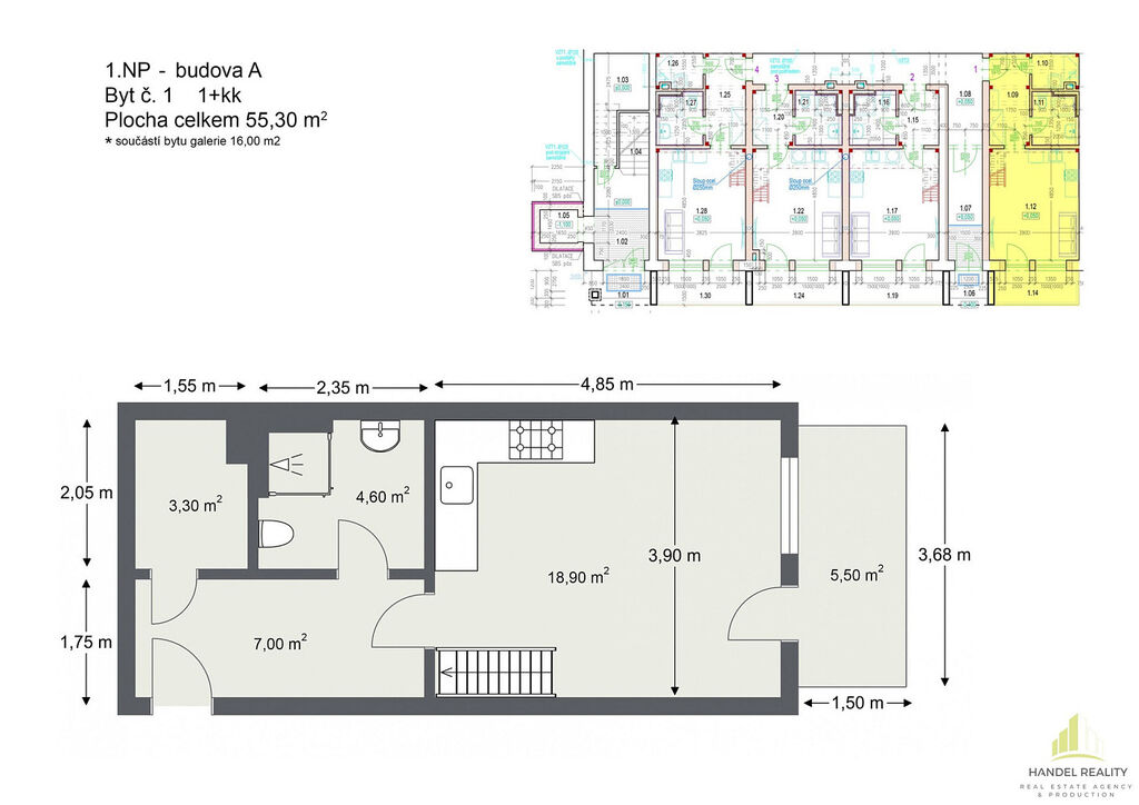 Nabízíme krásný byt 1+kk k prodeji v Břeclavi. S plochou 55,7 m² poskytuje dostatek prostoru pro pohodlné bydlení pro jednotlivce nebo pár. Byt se nachází v přízemí a disponuje moderním a útulným interiérem, je také vybaven vlastní klimatizací, tím zajistí příjemné a komfortní prostředí po celý rok. Vzhledem k výšce stropu, která činí 4,5 m na bytu naleznete i galerii, která je určená například pro vybudováno ložnice. Dále byt disponuje terasou o velikosti 5,5 m². K bytu přináleží kóje s vlastní přípojkou elektřiny.