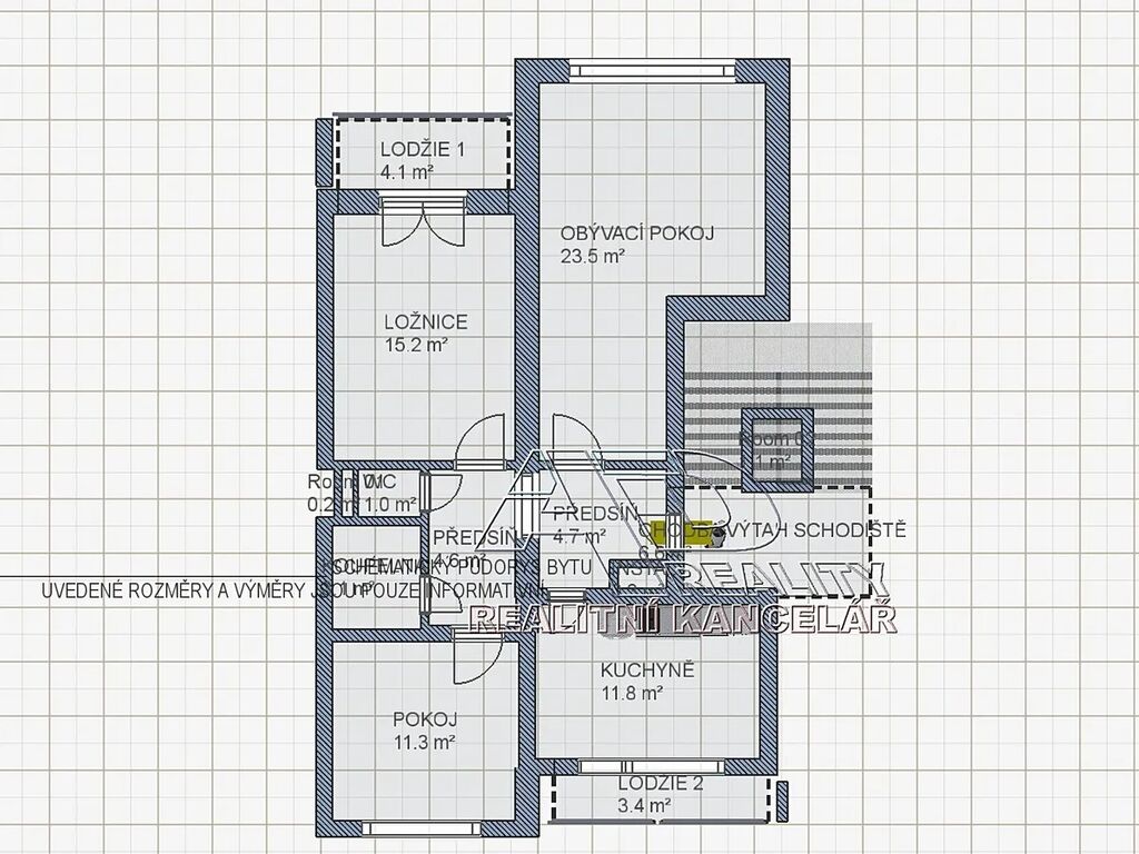 Dispozice bytu: obývací pokoj [23,4m2], samostatná ložnice [15,7m2] s lodžií [0,0m2], samostatný pokoj [11,5m2], kuchyně [11,7m2] s lodžií [0,0m2], prostorná předsíň [10,4m2], koupelna [3,0m2] a WC [0,9m2]. K bytu je k dispozici sklep v 1.NP (technické podlaží – přízemí) domu o výměře cca [2,7m2]. Topení v bytě centrální / ústřední dálkové (radiátory), podružné měření spotřeby teplé a studené vody (vodoměry), samostatné měření spotřeby elektřiny (elektroměr), samostatné měření spotřeby zemní plyn (plynoměr). V bytě je možnost připojení internetu (Starnet) a STA.