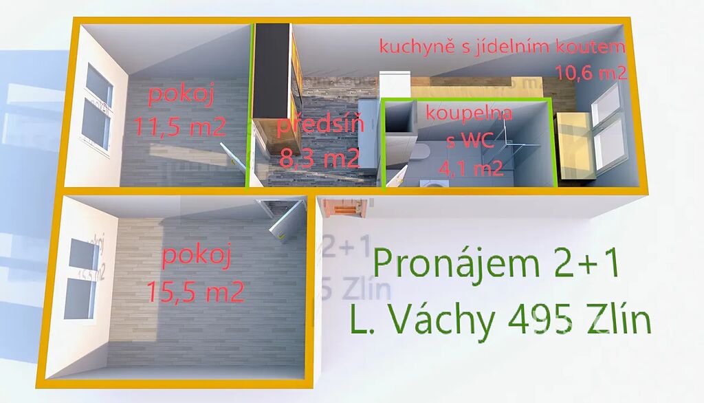 Ve výhradním zastoupení majitele nabízíme k pronájmu byt o dispozici 2+1 s užitnou plochou 54 m², který se nachází v panelovém domě na ulici L. Váchy ve Zlíně, části Prštné.