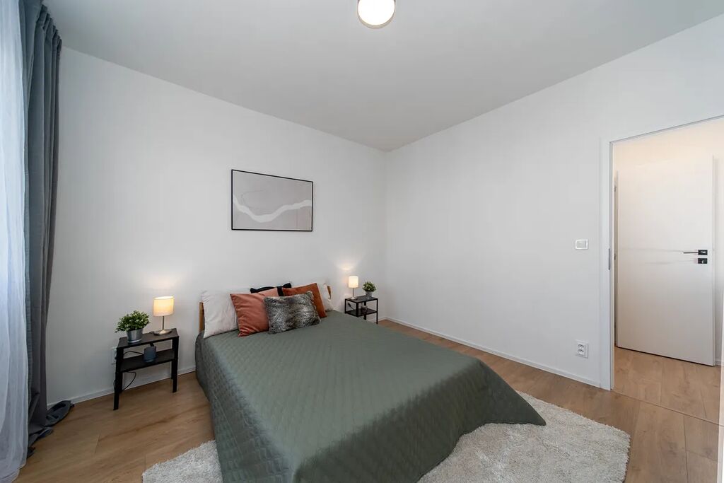 Dispozici bytu tvoří dvě neprůchozí ložnice, obývací pokoj spojený s kuchyní, prostorná koupelna se sprchovým koutem, samostatný záchod a technická místnost.