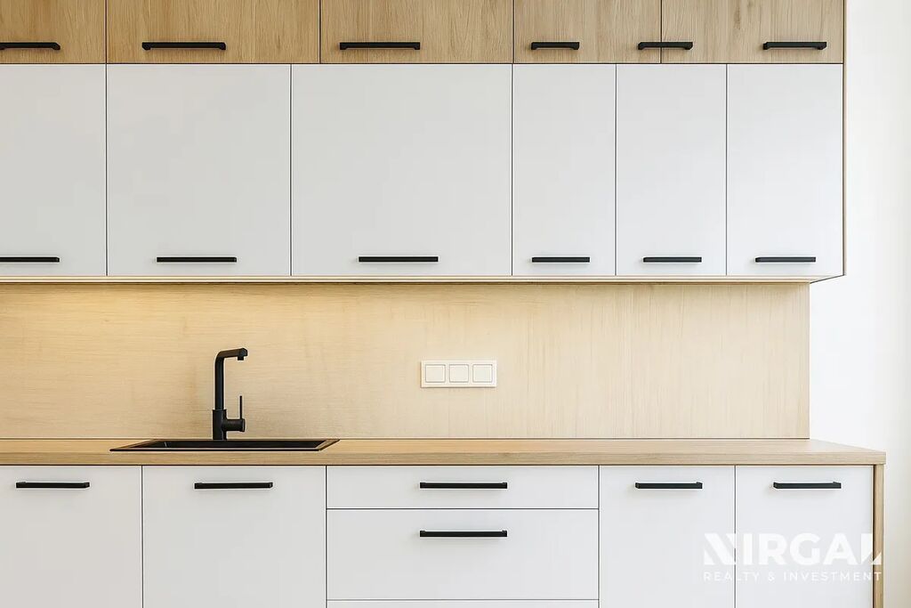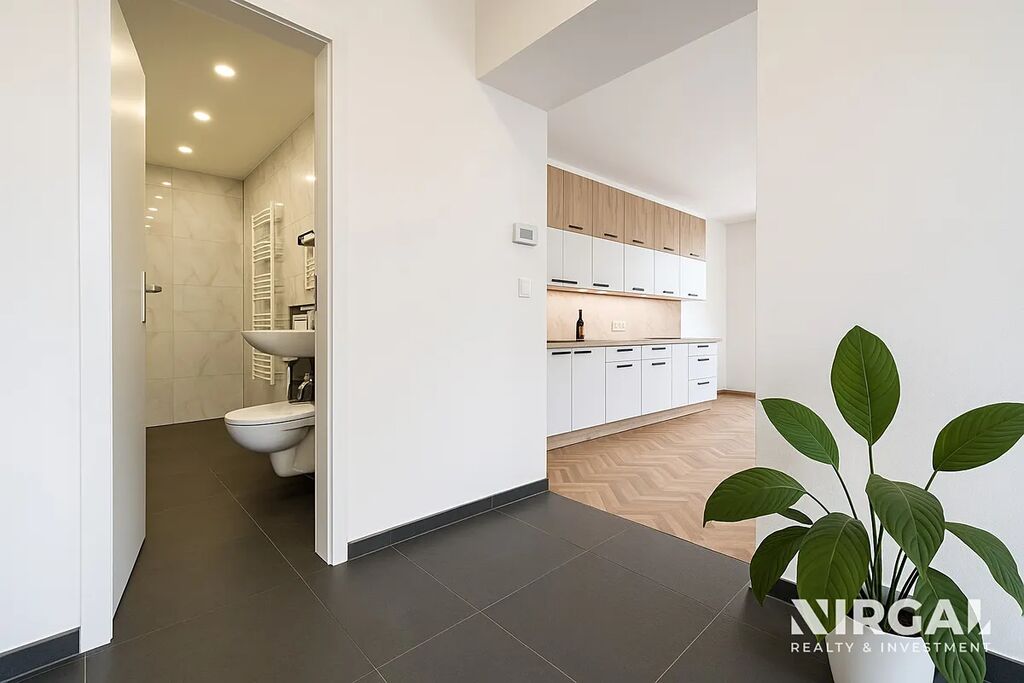 Interiér velmi prostorného obývacího pokoje, laděný ve světlých tónech, působí elegantně a vzdušně a nabízí harmonický prostor s dostatkem denního světla. Otevřená kuchyň je propojena s obývacím pokojem a ložnicí orientovanou do klidné ulice, což zajišťuje maximální soukromí. Oba pokoje jsou vybaveny elegantní parketovou podlahou, která interiéru dodává noblesní charakter. Byt je částečně vybavený – součástí je nová kuchyňská linka se spotřebiči (trouba, digestoř, varná deska, myčka, lednice). V koupelně se nachází sprchový kout, toaleta, podlahové vytápění a moderní žebříkový radiátor. Součástí vybavení je také pračka.
