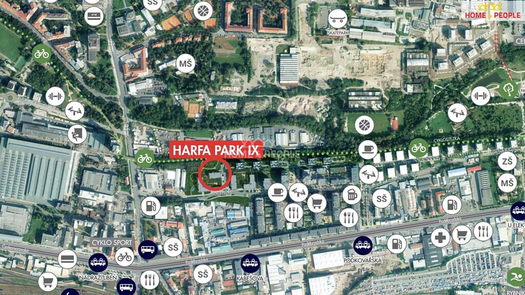 Občanská vybavenost v okolí: supermarket Albert, kavárna, restaurace, vinotéka, kadeřnictví a řada dalších obchodů a služeb. V pěší vzdálenosti jsou obchodní centra Galerie Harfa a NC Fénix. Sportovní nadšence potěší oblíbená cyklostezka v sousedství rezidence a venkovní workoutové hřiště.