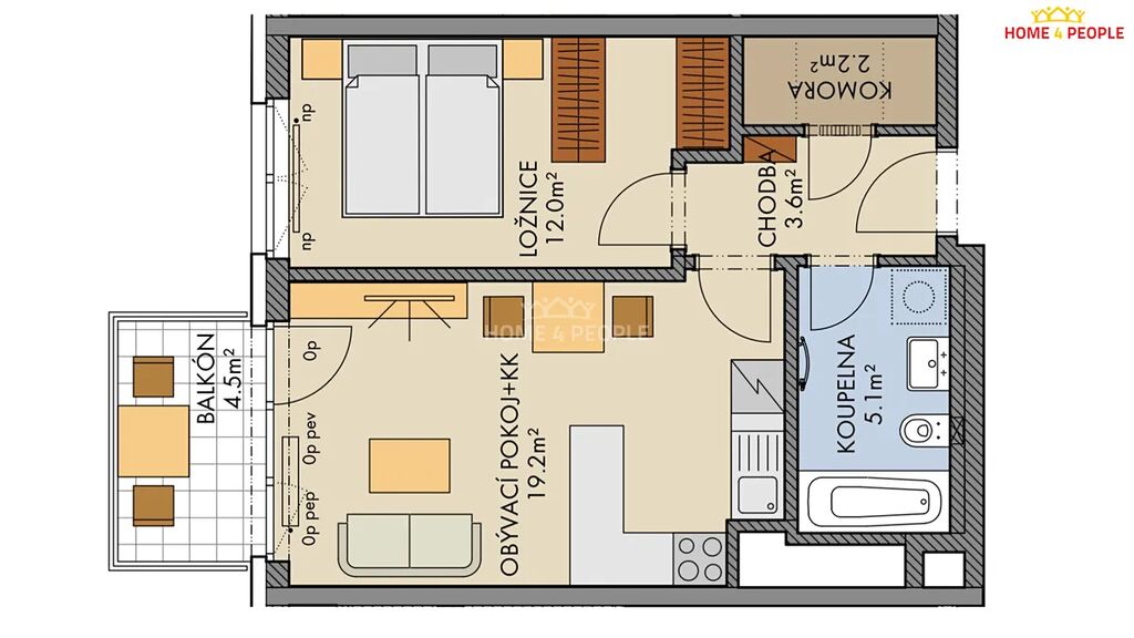 Byt tvoří obývací pokoj s kuchyňským koutem, ložnice, koupelna s toaletou, vstupní chodba, komora a balkon. Nachází se v 3. nadzemním podlaží novostavby s výtahem (celkem 10 NP). Díky severní orientaci se v létě nepřehřívá a okna nabízejí krásný výhled do zeleně.