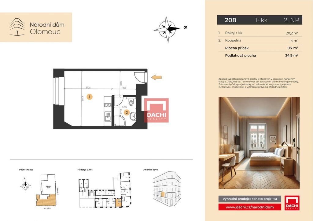 V rámci projektu nabízíme byt č. 208 o dispozici 1+kk s podlahovou plochou 24,9m, který se nachází ve 2. nadzemním podlaží.