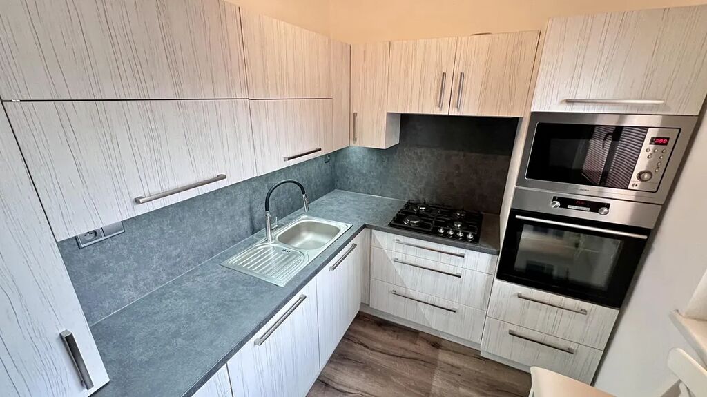 Kuchyň je plně vybavena: kuchyňská linka, plynová varná deska, elektrická trouba, digestoř, myčka na nádobí a dřez s vodovodní baterií vám usnadní každodenní vaření i úklid.