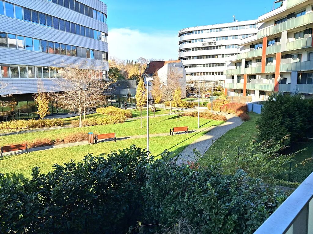 Bytová jednotka sestává z předsíně, dvou ložnic, ze kterých je vstup na balkon, dále obývacího pokoje s plně vybaveným kuchyňským koutem, pracovny-zimní zahrady, samostatného WC, koupelny s vanou a šatny. Vyjma parkovacího stání a parkovacího boxu k bytu náleží skladovací prostor o výměře 4 m2.