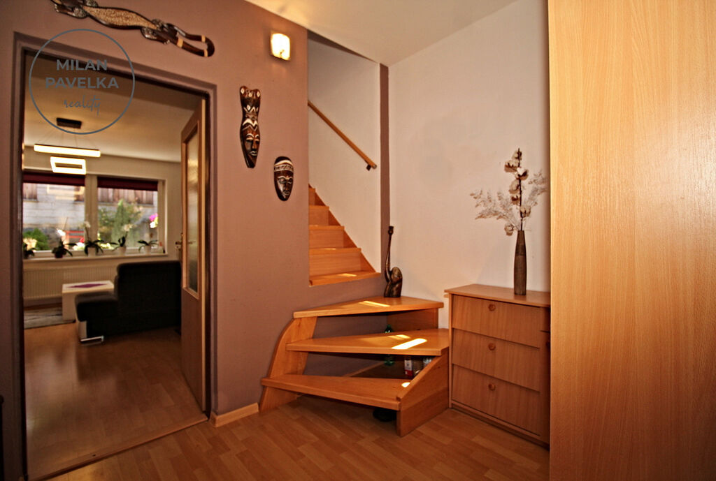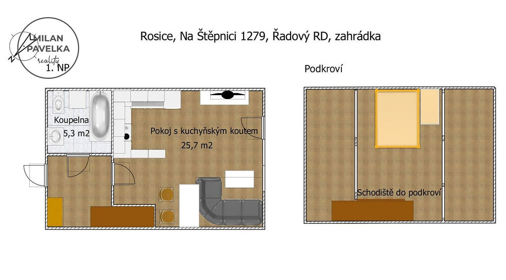 Po vstupu do zádveří, odkud je vstup do koupelny s WC o výměře 5,3 m² a schodiště do podkroví, dále před Vámi se otevře světlý a prostorný obývací pokoj s kuchyňským koutem o výměře 25,7 m² a dále vstup na terasu s posezením a se zahrádku o celkové výměře 24 m².