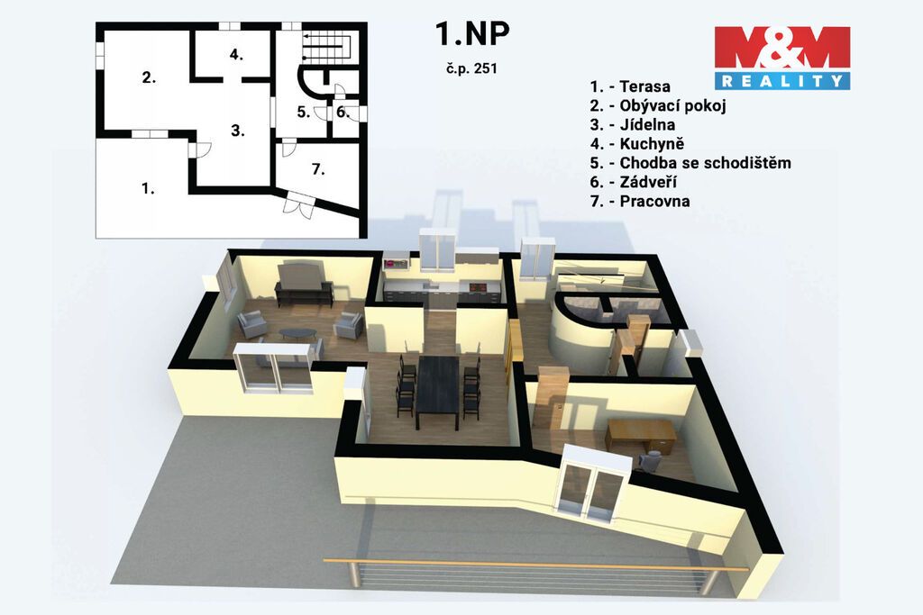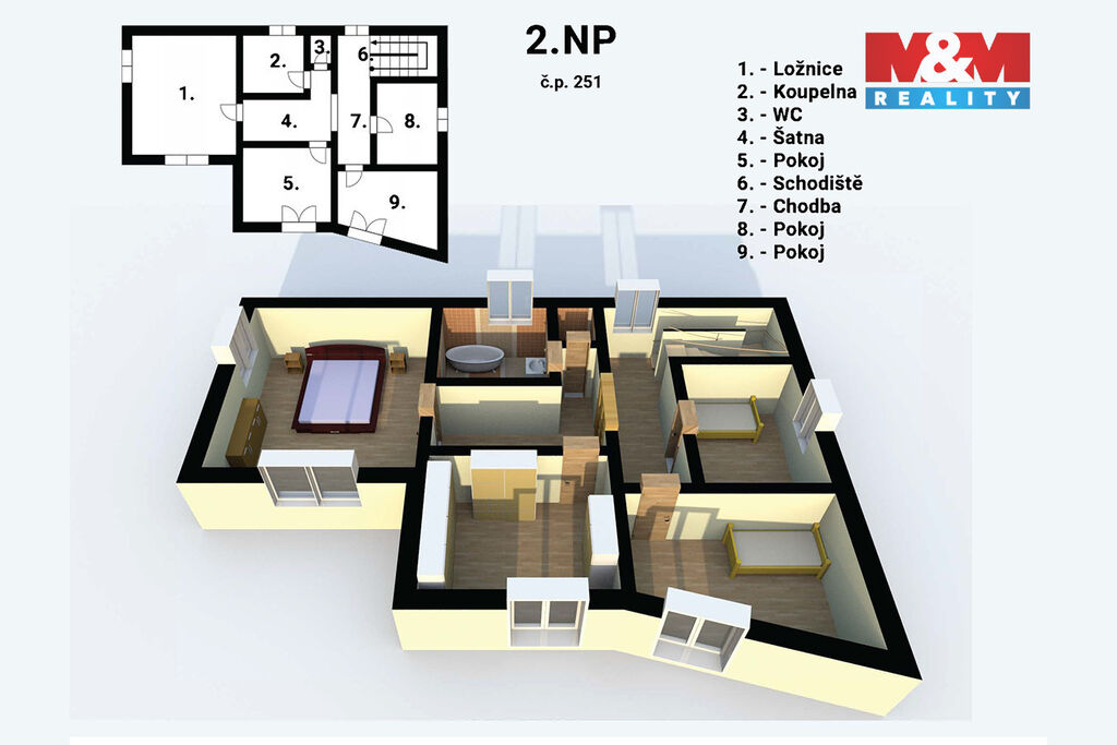 První dům, postavený v roce 1999, je podsklepený a dispozičně řešen jako 6+1 s užitnou plochou 193 m². V přízemí se nachází vstupní chodba se schodištěm, kuchyně, dva pokoje a koupelna s WC. V patře jsou čtyři samostatné pokoje, chodba, koupelna s vanou i sprchovým koutem a samostatné WC. V suterénu je garáž pro dvě vozidla. V roce 2023 byl instalován nový plynový kotel.