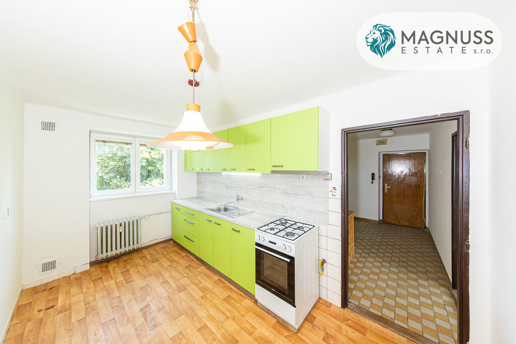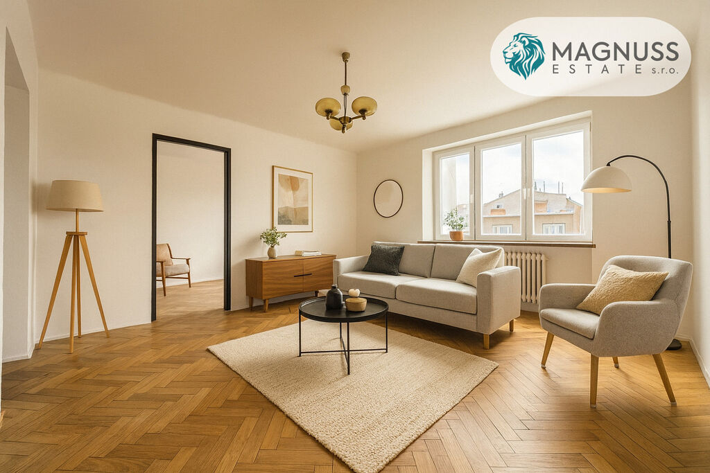 Dispozice bytu zahrnuje tři obytné pokoje (každý o velikosti přibližně 15 m²), samostatnou kuchyň orientovanou na východ (cca 9 m²), koupelnu, samostatné WC a předsíň. Byt je v původním stavu a je ideální k rekonstrukci dle vlastních představ. K bytu náleží také dva sklepy, každý o rozloze cca 12 m².