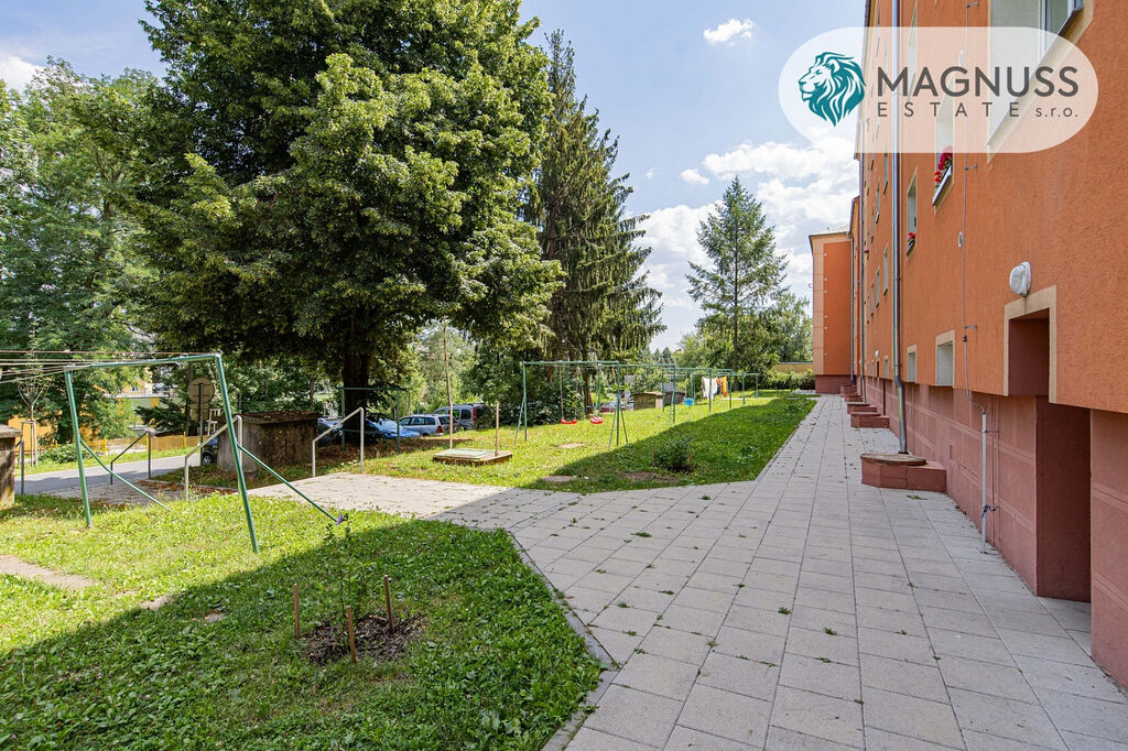 Za domem se nachází klidná travnatá plocha se vzrostlými stromy, kterou využívají především místní obyvatelé k relaxaci. K dispozici je rovněž parkovací prostor, kde je možné pohodlně zaparkovat v průběhu celého dne.