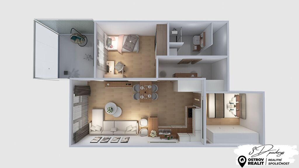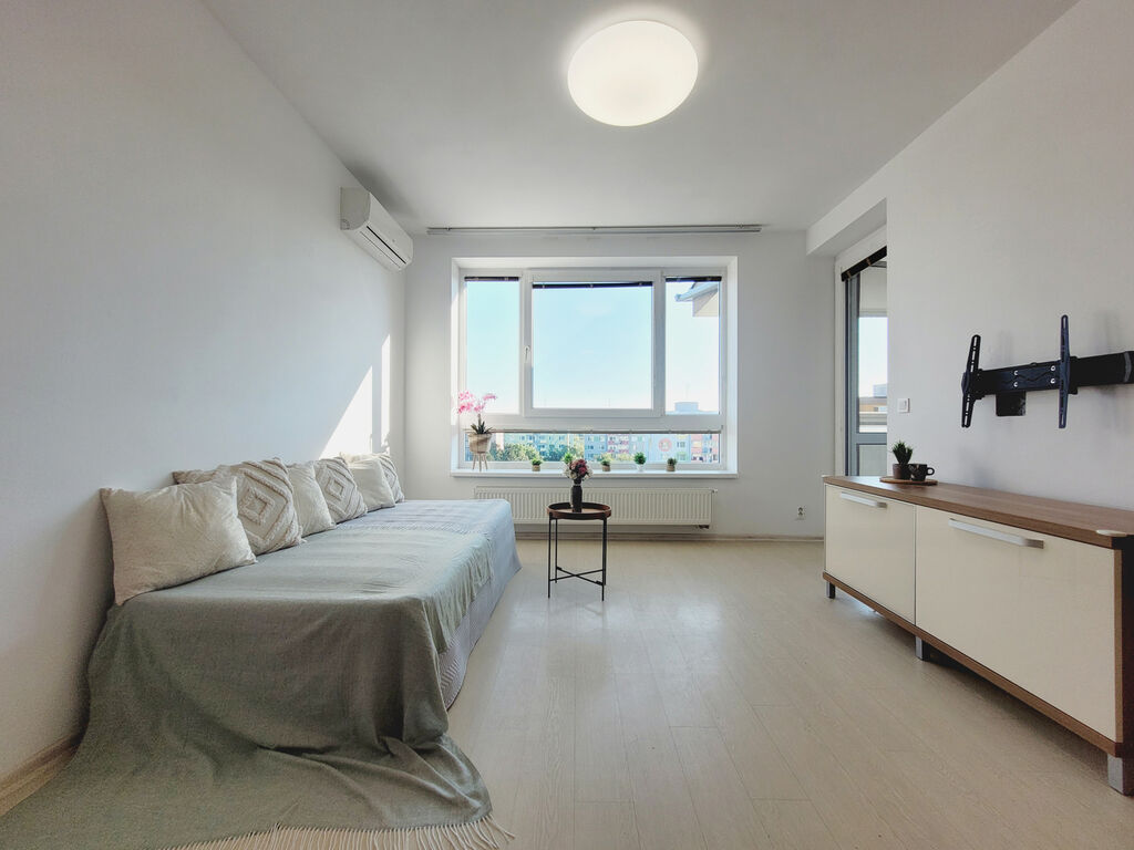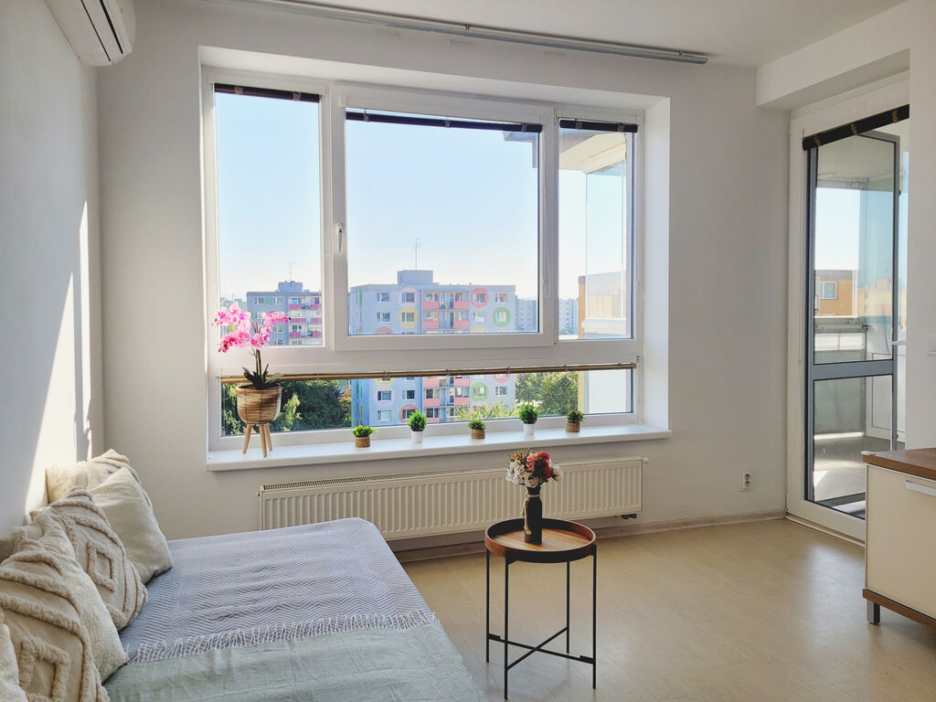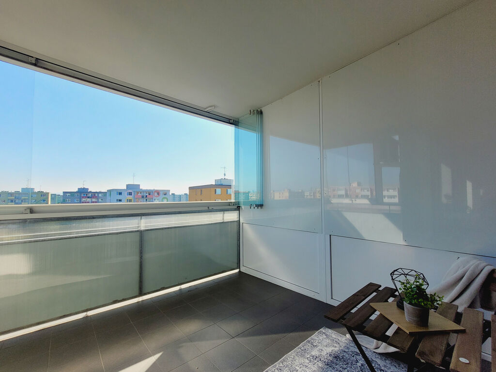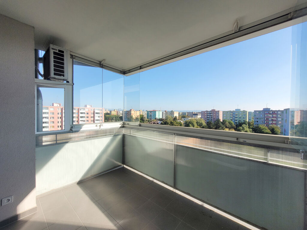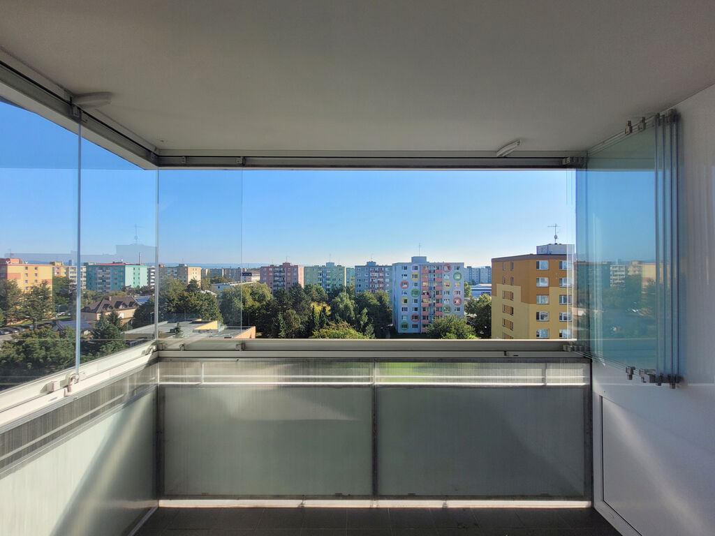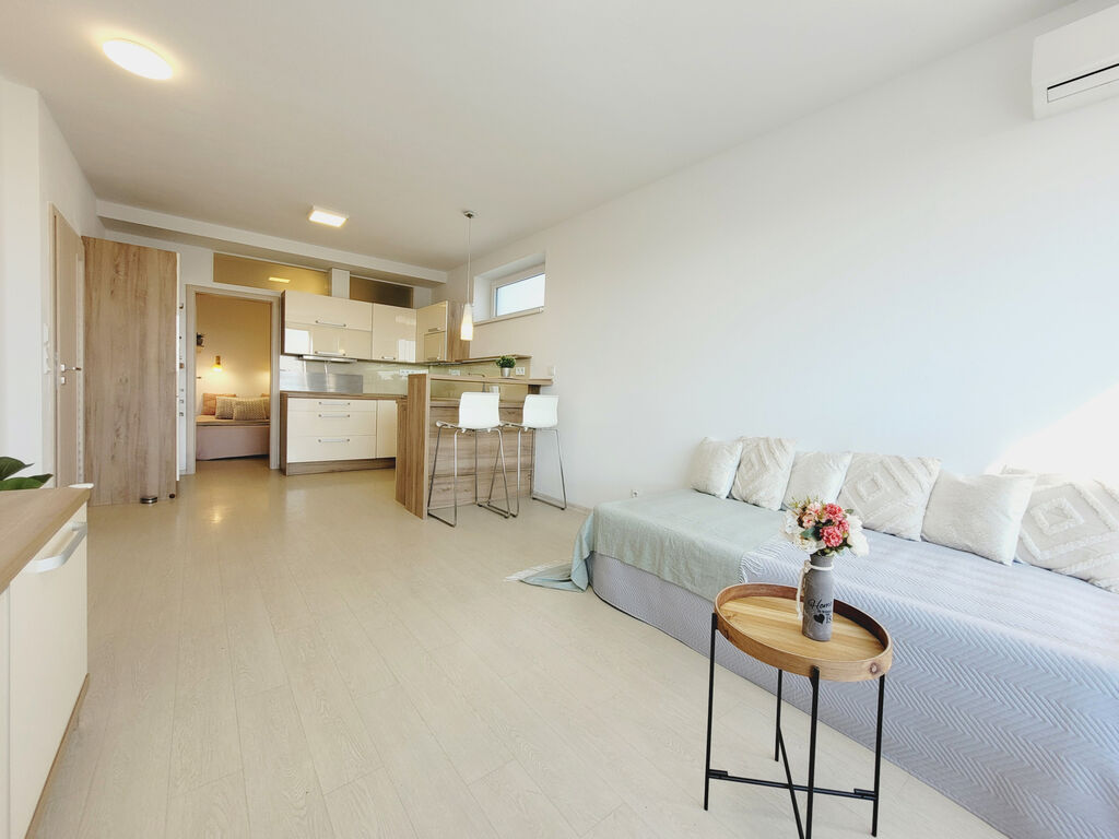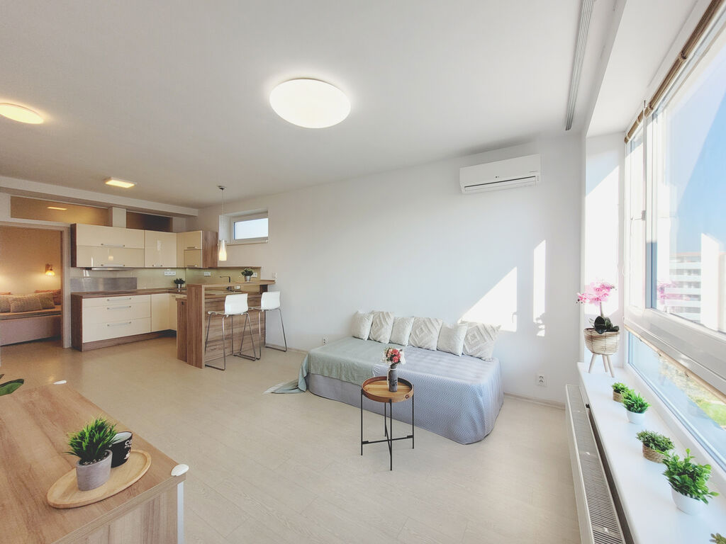 Dominantou bytu je velký obývací pokoj propojený s moderní kuchyní a barovým pultem. Kuchyňská linka je vybavena spotřebiči (trouba, myčka, mikrovlnná trouba, varná deska, lednice). Obývací část s jídelním koutem disponuje klimatizací a díky velkým oknům nabízí působivý výhled na okolí včetně Sv. Kopečku. Z této místnosti je vstup na zasklenou lodžii o ploše 10 m², která poslouží jako úložný prostor nebo místo k odpočinku. Soukromí zajišťuje hliníková clona oddělující sousední balkón.