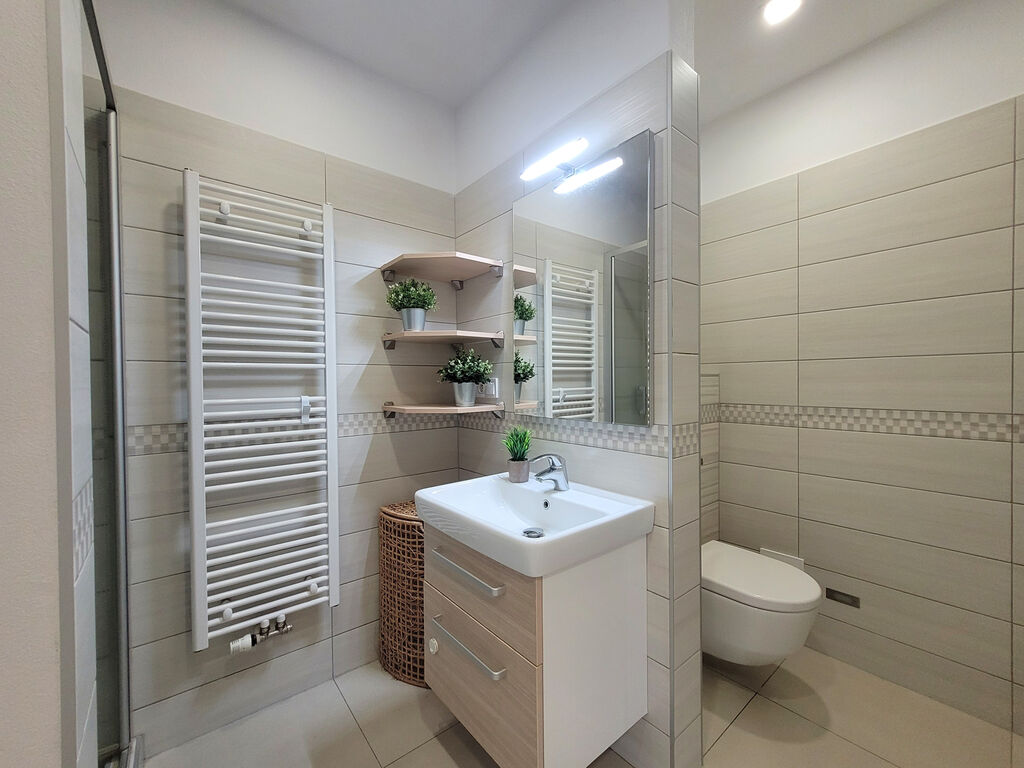 Koupelna nabízí sprchový kout, podlahové topení a prostor pro pračku i sušičku, přičemž WC je částečně odděleno. Vstupní chodba disponuje vestavěnými skříněmi a navíc je součástí bytu i komora na stejném patře, vhodná například pro uskladnění sezónních věcí.