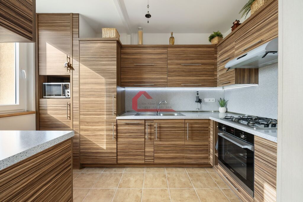 - kuchyně s kuchyňskou linkou na míru včetně spotřebičů (vestavěná lednice s mrazákem a myčka šíře 40cm, plynový sporák, digestoř