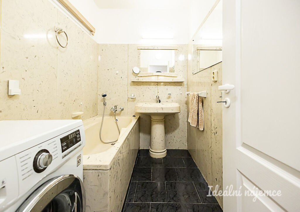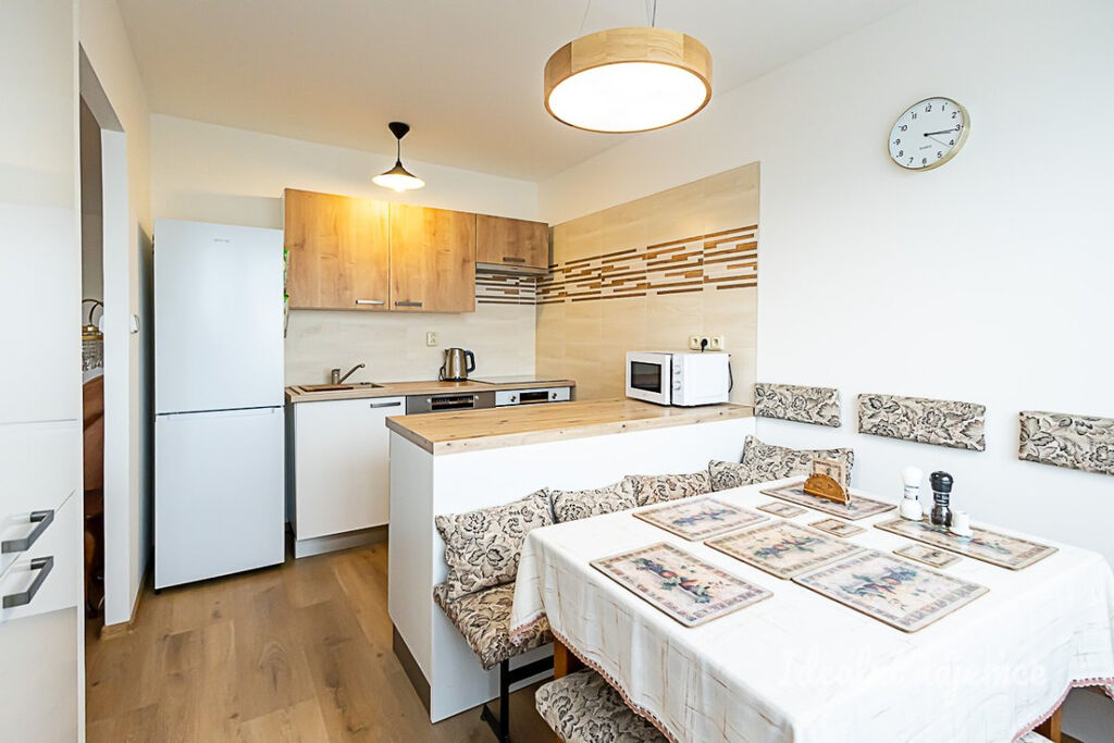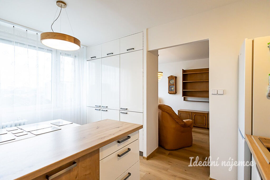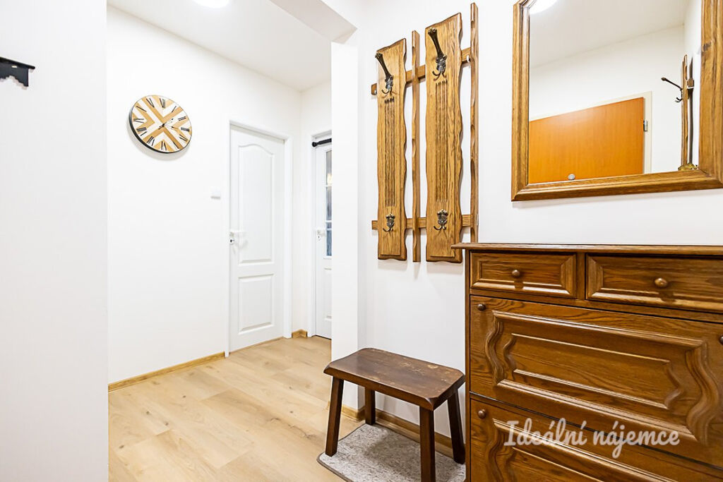Byt je částečně vybavený, takže usnadní start do nového bydlení. Kuchyně prošla rekonstrukcí a nabízí moderní linku s varnou deskou, elektrickou i mikrovlnnou troubou, digestoří, myčkou, lednicí s mrazákem a jídelním koutem. Obývací pokoj je útulně zařízen pohodlnou sedací soupravou, konferenčním stolkem, televizí, praktickým úložným prostorem a doplněn postelí a pracovním stolem s židlí. Dva samostatné pokoje poskytují dostatek místa a lze je využít jako ložnici, dětský pokoj nebo pracovnu. Koupelna je vybavena vanou, umyvadlem a pračkou, toaleta je samostatná. Součástí bytu je i praktická šatna.