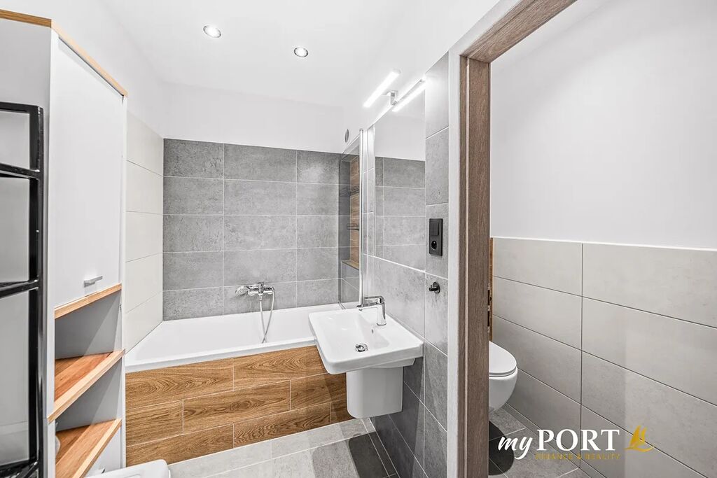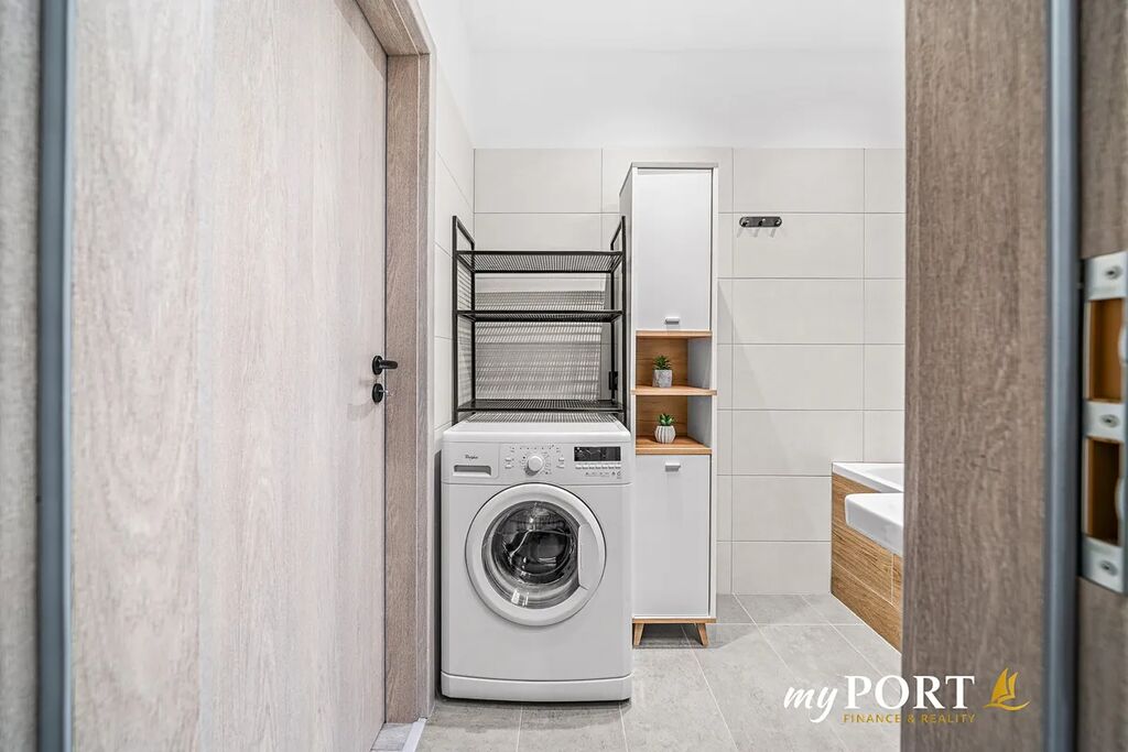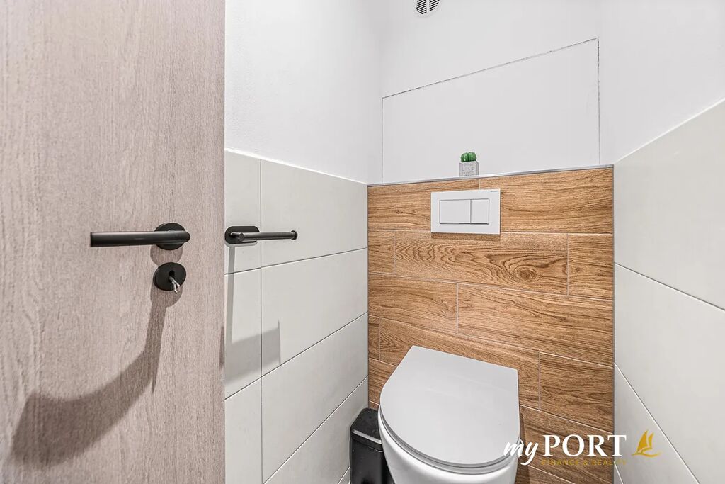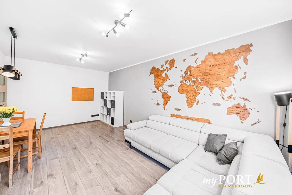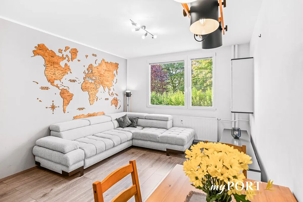 Dominantou bytu je stylová nástěnná dřevěná mapa světa dokreslující atmosféru bytu. V předsíni oceníte několik skříní a botníků. Nadšeni budete také z prostorné kuchyňské linky s barovým pultem, která poskytuje více než dostatek úložných prostor. Další úložné prostory nabízí potravinová skříň. V celém bytě jsou podlahy vinylové, vodě a světlu odolné. Díky nim je pak podlaha příjemně teplá. V koupelně a na samostatném WC naleznete velkoformátovou dlažbu.