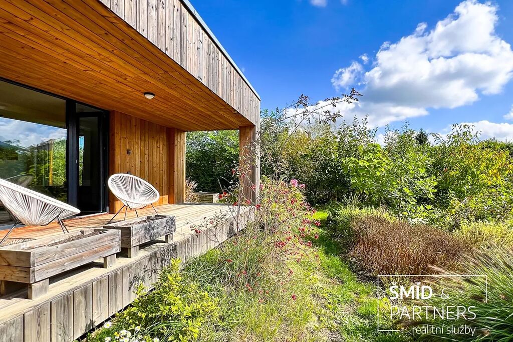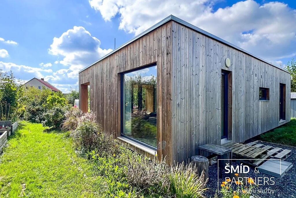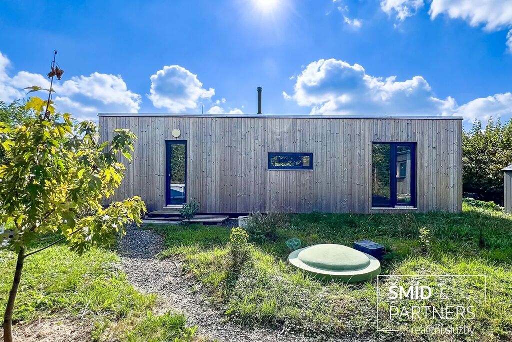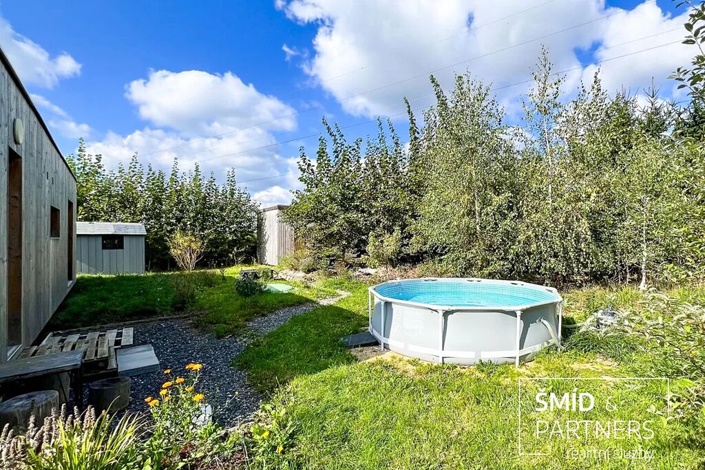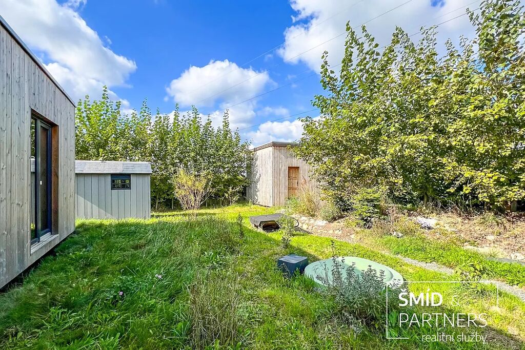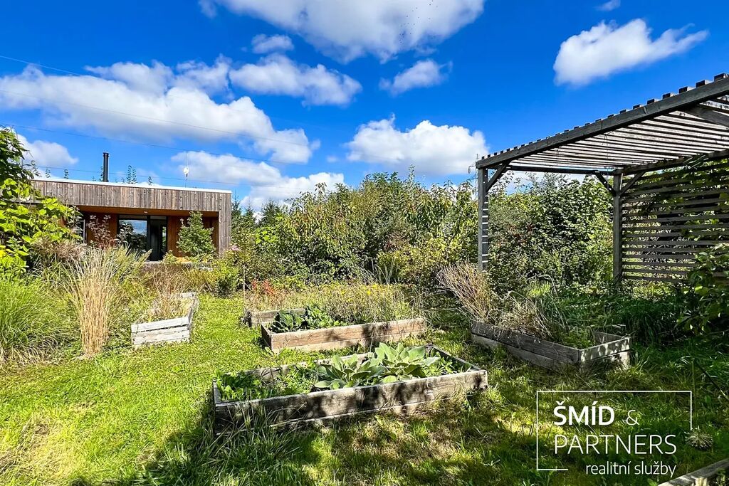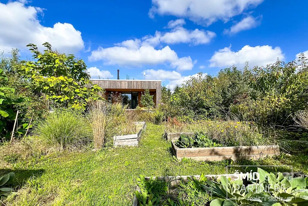 Naše kancelář zprostředkovává prodej velice atraktivního, moderního a ekologického domu v krásné oblasti Posázaví. Tento dům, postavený firmou Blokki specializující se na modulové a modulární stavby domů upcyklací lodních kontejnerů, se nachází v obci Užice - Čekánov v blízkém sousedství města Sázava. Čekánov je skvělé místo pro trávení aktivního života, k čemuž inspiruje okolní příroda s ikonickou řekou Sázavou, rozlehlými lesy a místy nabízejícími mnoho outdoorových aktivit. Pokud hledáte jen klidné útočiště, pak Vám rozlehlá, více než patnáct set metrů velká, zahrada obklopující dům nabídne notnou dávku soukromí a klidu. Zahrada je svou vlastní kapitolou. Je, jak již bylo zmíněno, opravdu prostorově bohatě dimenzovaná a pečlivě vybudovaná jako permakulturní na základě principů přírodních zahrad. Tento koncept zahrad využívá trvale udržitelný a samostatně se obnovující systém bez zásahů, jako jsou např. postřiky proti škůdcům nebo ruční plení. Přestože permakulturní zahrady jsou převážně užitkové, dokáží plnit i funkci okrasnou, čehož je tato zahrada jasným důkazem. Nespornou výhodou je její menší náročnost na údržbu a zálivku, velká druhová rozmanitost s velkým podílem rostlin, které dokáží majitele téměř celoročně zásobit výpěstky. Na zahradě se kromě skleníku, vyvýšených záhonů a plochy pro dětské hraní nachází také velmi praktická stavba dílny (ateliéru), která může sloužit skvěle i jako samostatná pracovna či případně domek pro hosty. Je zde zavedena elektřina a taktéž voda. K ukládání zahradního, sportovního či jiného vybavení jsou k dispozici další dva montované zahradní domky.