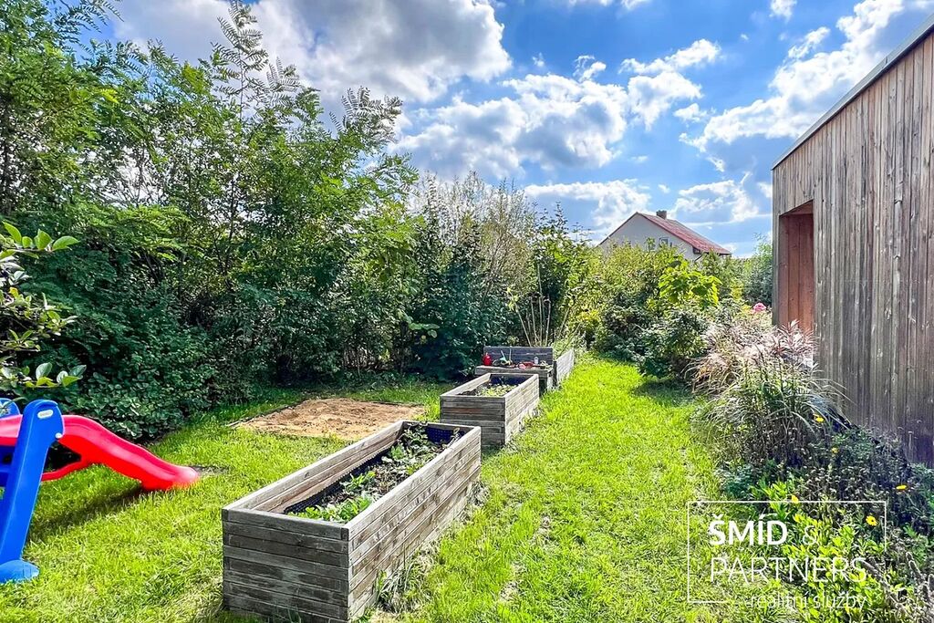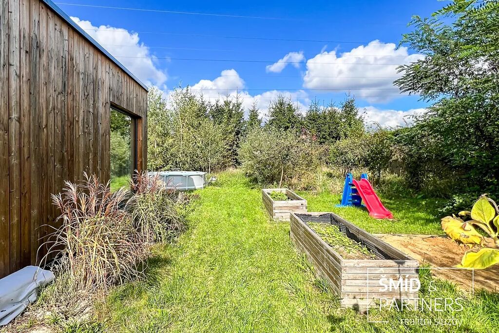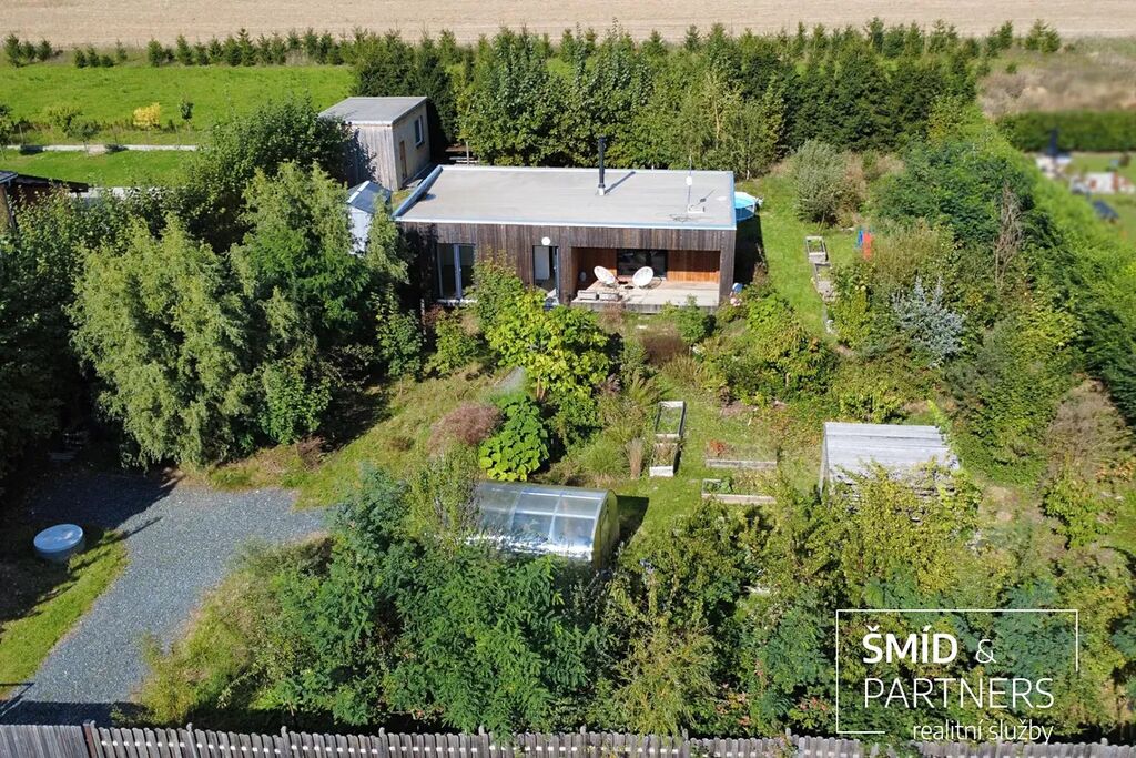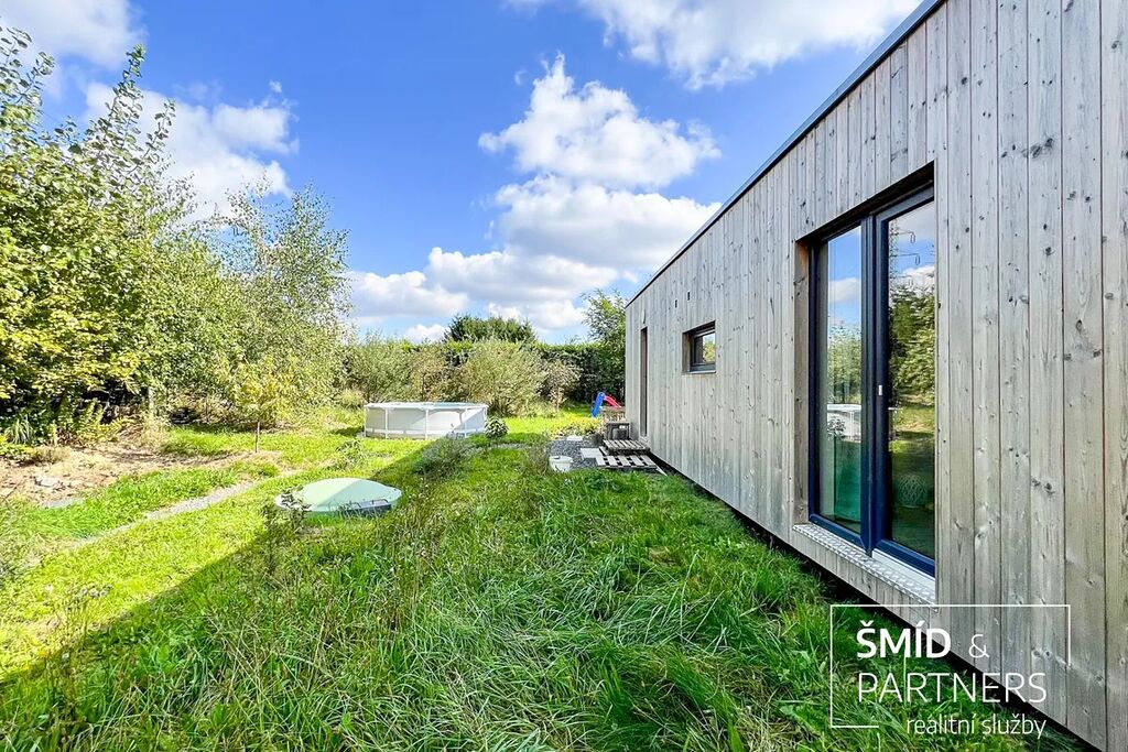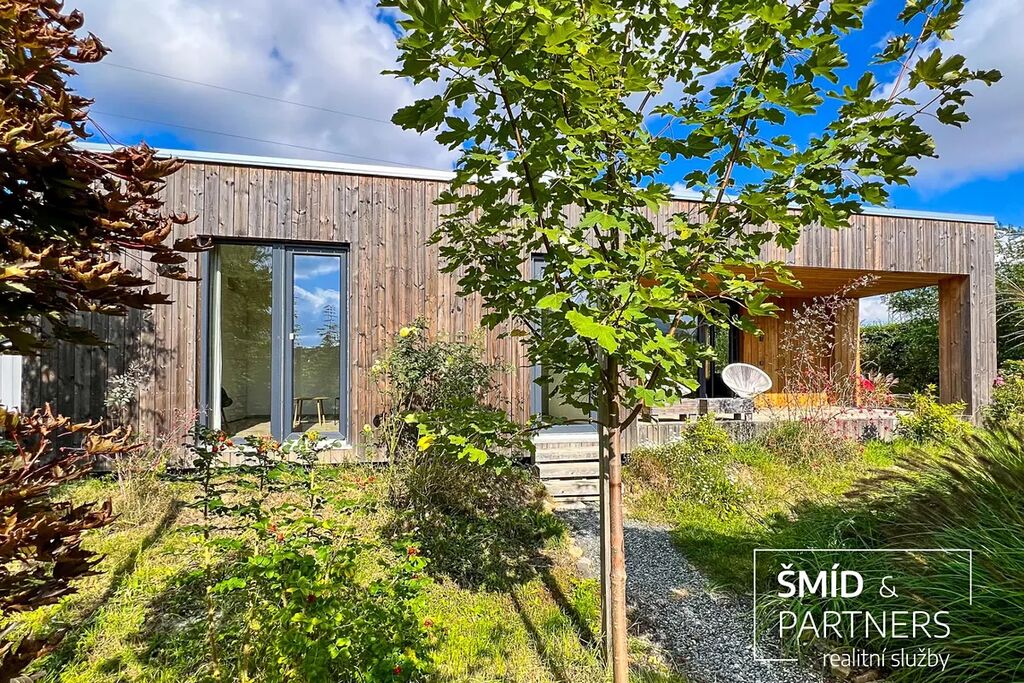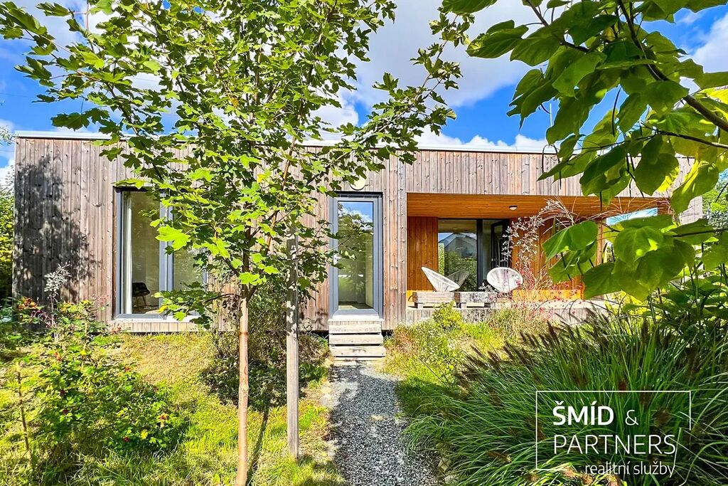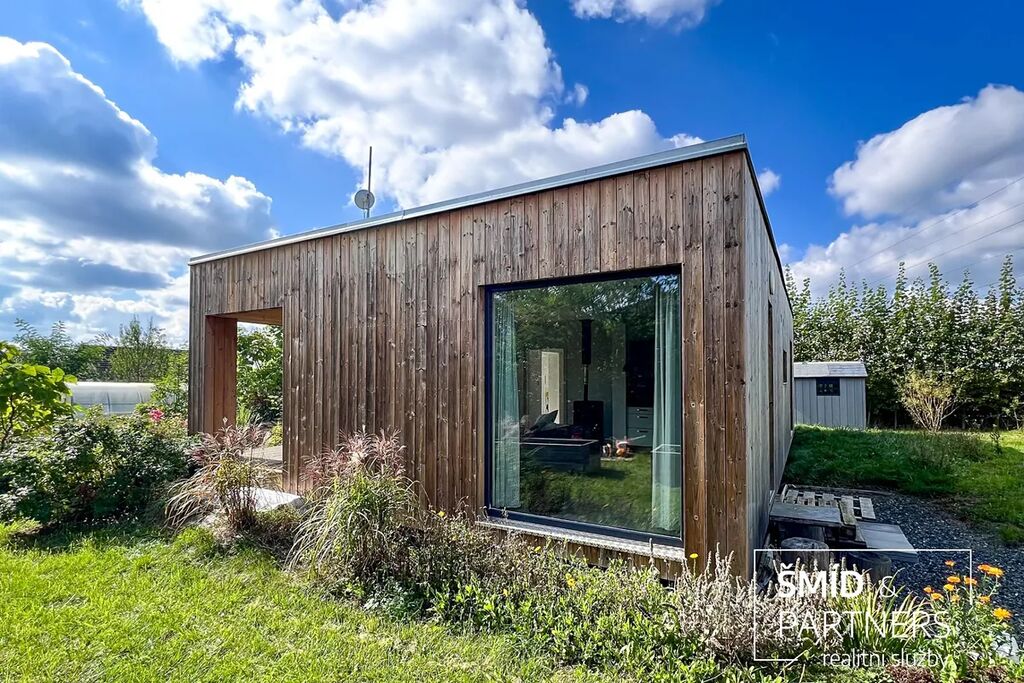 Naše kancelář zprostředkovává prodej velice atraktivního, moderního a ekologického domu v krásné oblasti Posázaví. Tento dům, postavený firmou Blokki specializující se na modulové a modulární stavby domů upcyklací lodních kontejnerů, se nachází v obci Užice - Čekánov v blízkém sousedství města Sázava. Čekánov je skvělé místo pro trávení aktivního života, k čemuž inspiruje okolní příroda s ikonickou řekou Sázavou, rozlehlými lesy a místy nabízejícími mnoho outdoorových aktivit. Pokud hledáte jen klidné útočiště, pak Vám rozlehlá, více než patnáct set metrů velká, zahrada obklopující dům nabídne notnou dávku soukromí a klidu. Zahrada je svou vlastní kapitolou. Je, jak již bylo zmíněno, opravdu prostorově bohatě dimenzovaná a pečlivě vybudovaná jako permakulturní na základě principů přírodních zahrad. Tento koncept zahrad využívá trvale udržitelný a samostatně se obnovující systém bez zásahů, jako jsou např. postřiky proti škůdcům nebo ruční plení. Přestože permakulturní zahrady jsou převážně užitkové, dokáží plnit i funkci okrasnou, čehož je tato zahrada jasným důkazem. Nespornou výhodou je její menší náročnost na údržbu a zálivku, velká druhová rozmanitost s velkým podílem rostlin, které dokáží majitele téměř celoročně zásobit výpěstky. Na zahradě se kromě skleníku, vyvýšených záhonů a plochy pro dětské hraní nachází také velmi praktická stavba dílny (ateliéru), která může sloužit skvěle i jako samostatná pracovna či případně domek pro hosty. Je zde zavedena elektřina a taktéž voda. K ukládání zahradního, sportovního či jiného vybavení jsou k dispozici další dva montované zahradní domky.