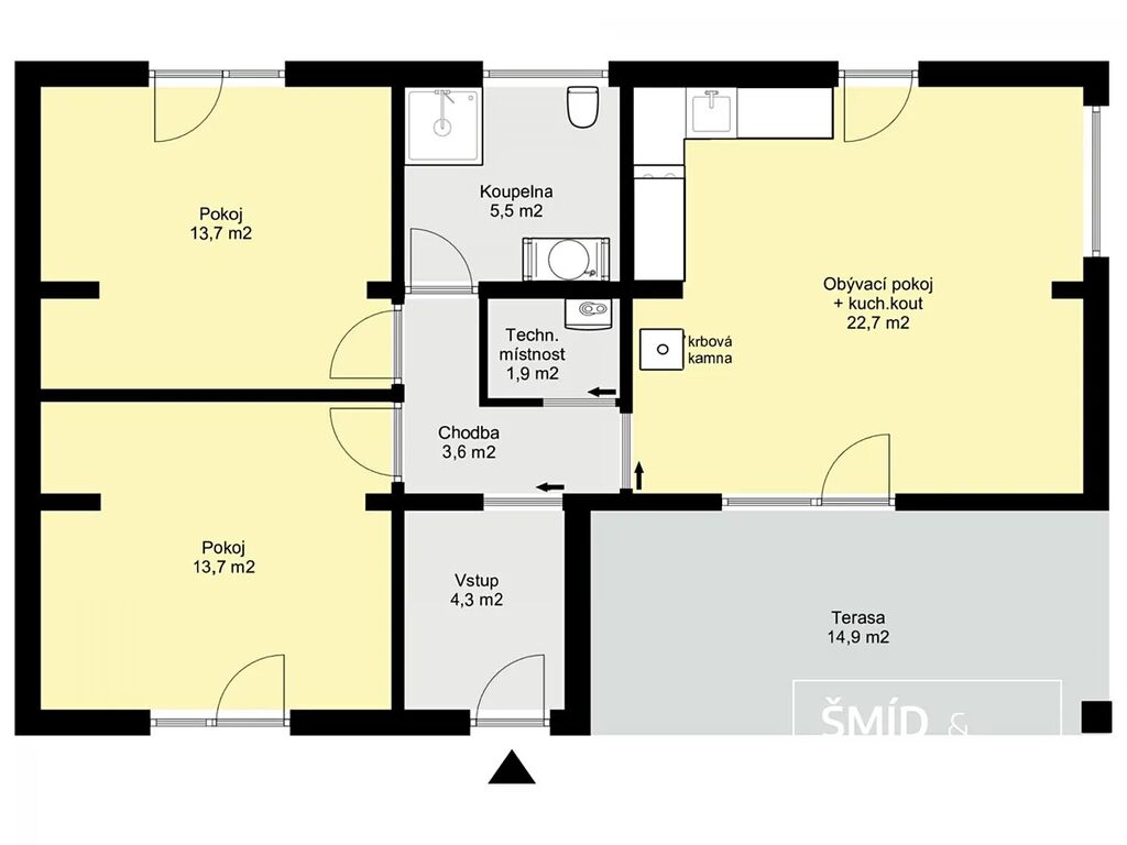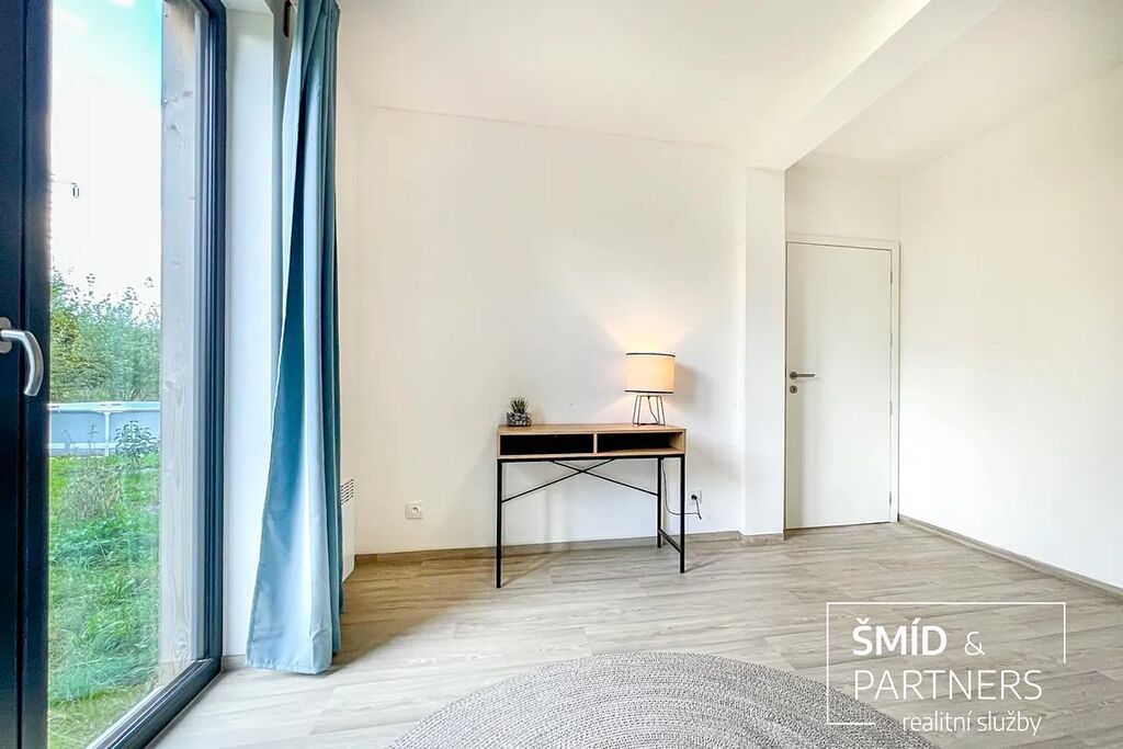 Obytná plocha činí 80 m2, z čehož na terasu připadá 15 m2. Dispozice je 3+kk s jednou koupelnou a toaletou, dvěma ložnicemi, obývacím pokojem s kuchyňským koutem a technickou místností. Samozřejmě zde nechybí vstupní chodba s prostorem pro šaty a obuv. Skvělými prvky domu jsou francouzská okna v každé z místností a krytá terasa navazující na obývací část. Kuchyň je vybavena standardními spotřebiči, jako je kombinovaná chladnička, myčka nádobí, trouba s varnou deskou či digestoř s venkovním odtahem. Podlahy jsou z odolného vinylu a jsou barevně sjednoceny v celé podlahové ploše.