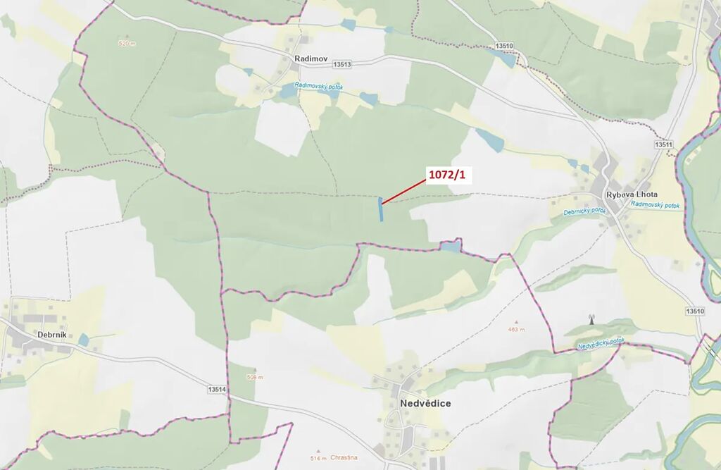 Lesní pozemek o výměře 2931 m2, parcelní číslo 1072/1, podíl 1/1, katastrální území Rybova Lhota, obec Skalice, obec s rozšířenou působností Soběslav, okres Tábor, Jihočeský kraj. Po těžbě.