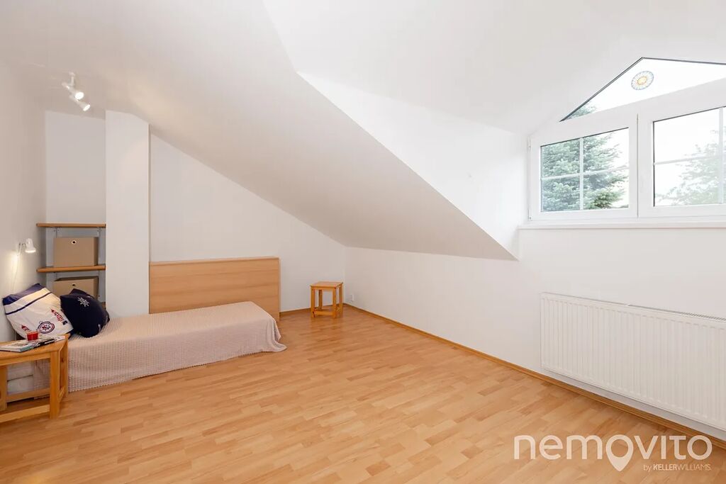 Druhé podlaží, které je přístupné přes široké schodiště, se v horní chodbě (24 m2) otevírá první místností přímo naproti, kterou je samostatná šatna (10 m2). Jelikož byl dům projektován s možností dvougeneračního bydlení, v největším pokoji (45 m2) je možné osadit kuchyni. Druhý největší pokoj (44 m2) je doplněn dalšími dvěma ložnicemi (22 a 19 m2), přičemž na podlaží je k dispozici koupelna se sprchou i vanou a další šatnou.
