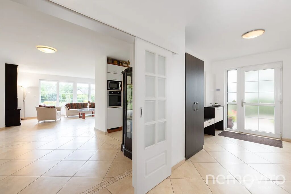 Dominantou prvního podlaží je obývací prostor s průhledem do prostoru s vnitřním bazénem. Zhruba 60 m2 v sobě spojuje prostor pro posezení, jídelnu a kuchyni. Společným jmenovatelem prvního podlaží jsou velká okna, která zejména v prostoru obýváku s kamny poskytují příjemné výhledy do zelené zahrady. Ačkoliv je kuchyně původní, je mimořádně zachovalá, kvalitní (Technistone) a také prostorná (linka do tvaru U s průhledem do obýváku). Prostor pro jídelnu je umístěný u průhledu k bazénu v části s výstupem na terasu.