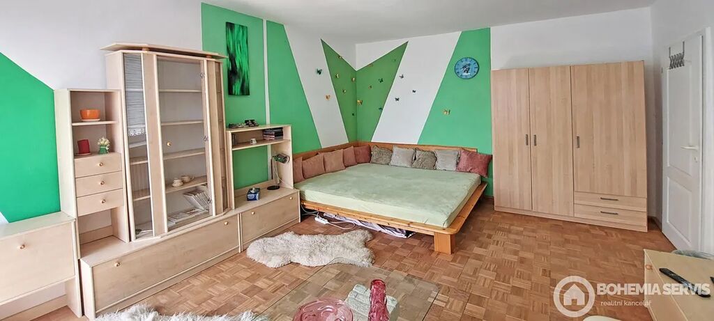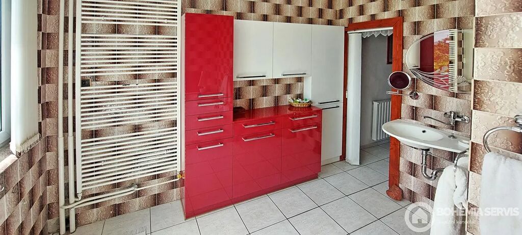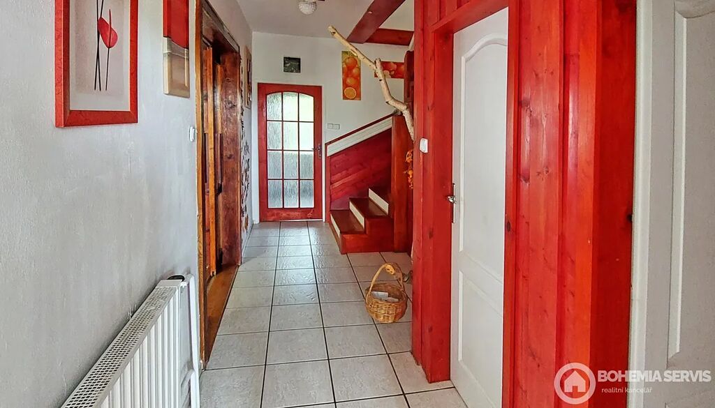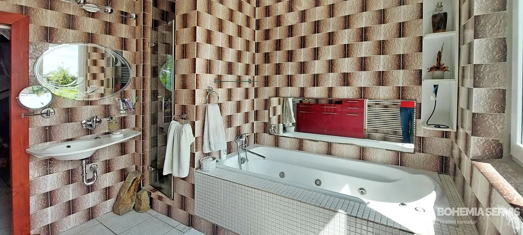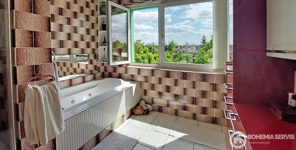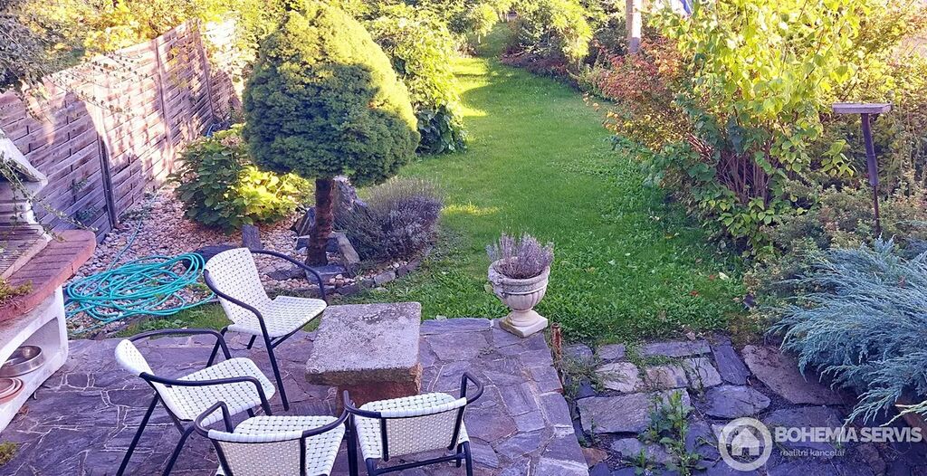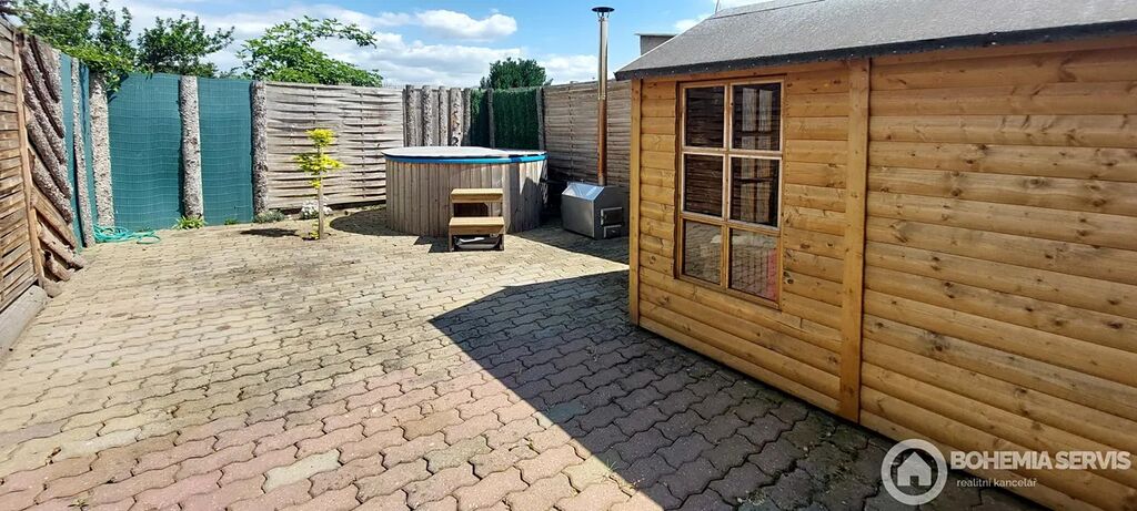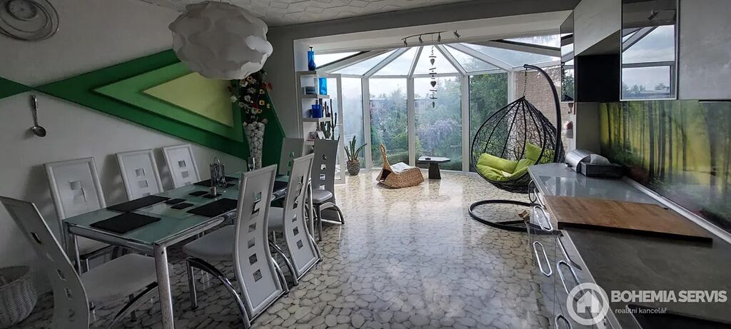 Rodinný řadový dům na jižním konci Čáslavi, užitná plocha 220 m2, s dispozicí 5+kk, pozemek 413 m2. Dům je vybavený solárními panely s dotovanou elektřinou a zateplený, klimatizací a saunou v suterénní části domu. Okrasná zahrada poskytuje jedinečné soukromí s venkovním krbem a posezením na kamenné terase. Dále zde najdeme wellness koutek s nahřívacím sudem a chatkou pro soukromou relaxaci nebo posezení s přáteli. Dispozice interiéru: ze vstupní síně je vchod do chodby, Odtud vpravo do prostorné moderní kuchyně s jídelnou a zimní zahradou s výhledem do zeleně zahrady. Tento prostor je volně propojený s obývací částí domu, která je atypická s krbem a se vstupem na lodžii, Z chodby dále vedou dveře do suterénu, na WC, koupelny a schody do 1. NP. Tam najdeme pracovnu, dětský pokoj s lodžií, ložnici s vestavěnými skříněmi i lodžií a odpočinkový otevřený prostor. Celkově je interiér velmi světlý, prostorný a vkusně zařízený.