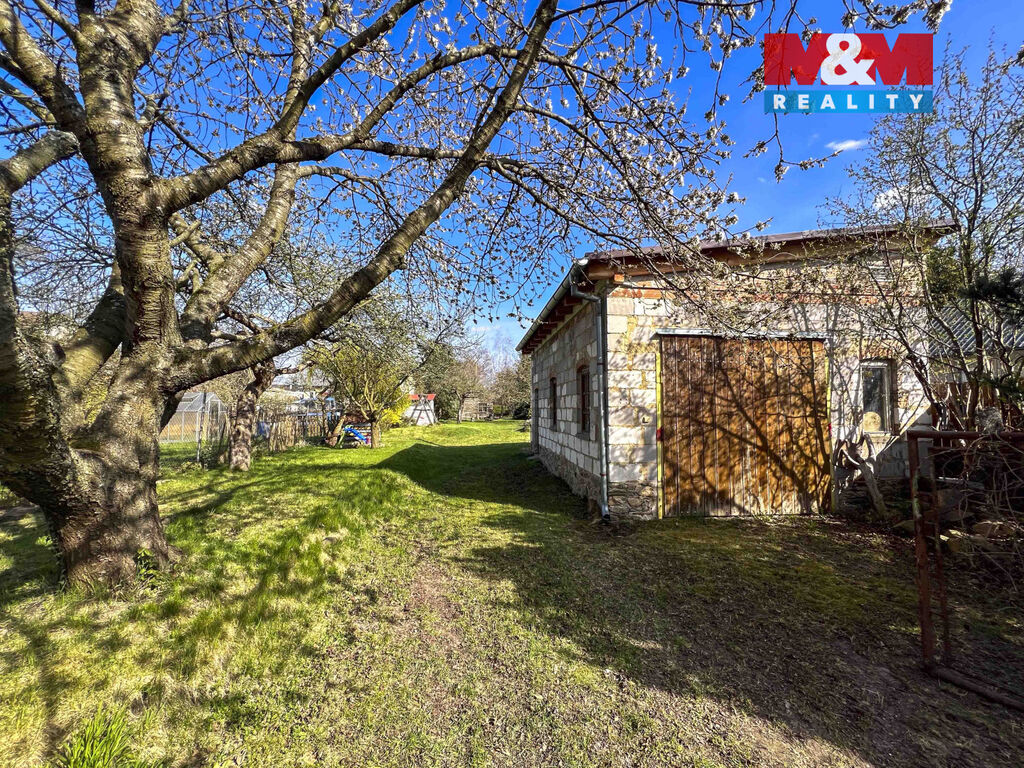 Součástí pozemku je zděná stavba (42 m²), která slouží jako víkendový domek s dřevěným patrem, zavedenou vodou a vytápěním kamny – ideální jako dočasné bydlení během stavby či jako rekreační objekt. Nechybí ani praktický dřevěný domek pro uskladnění materiálu v zadní části a malá kůlna.