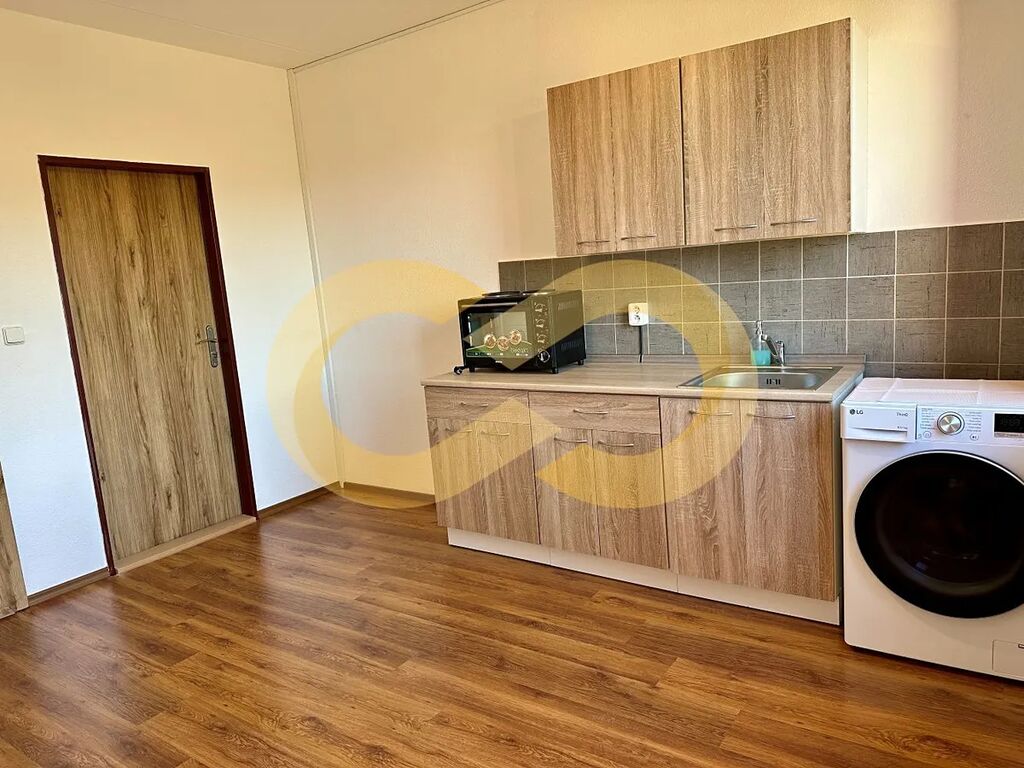Byt je ve velmi dobrém stavu. Součástí vybavení kuchyňského koutu jsou spotřebiče – mikrovlnná trouba s varnou plotýnkou a pračka.