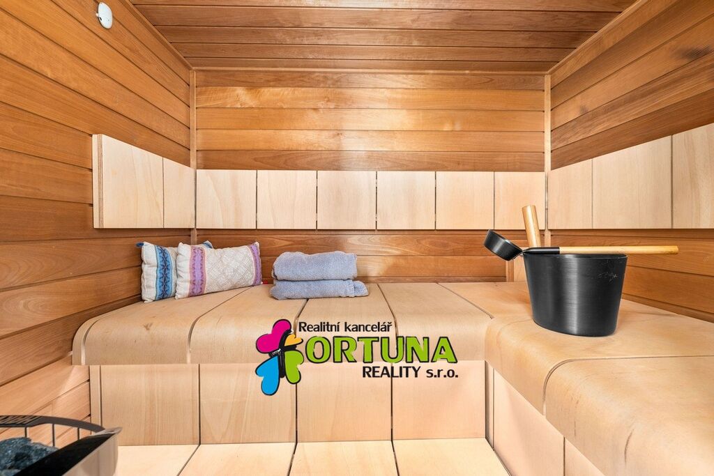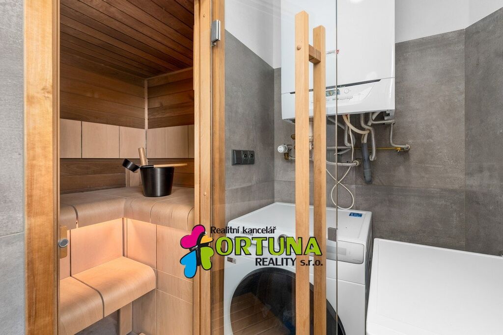 V přízemí domu se nachází velkorysý obývací pokoj s krbovými kamny (s možností teplovodního výměníku), moderní kuchyň s jídelnou, ložnice, koupelna se sprchovým koutem a saunou a samostatné WC. Z přízemí je přímý vstup také do garáže.