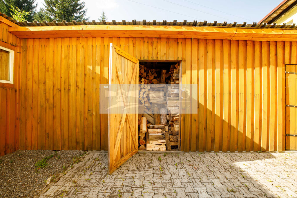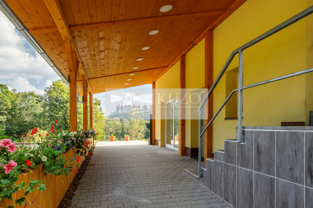 K domu přiléhá zastřešená terasa vhodná k příjemnému posezení. V zadní části zahrady se nachází prostorný dřevěný přístřešek ke stání aut. Na zahradě je také vodní nádrž s chovnými rybami. Vjezdová brána reaguje na dálkové ovládání prostřednictvím aplikace v telefonu.