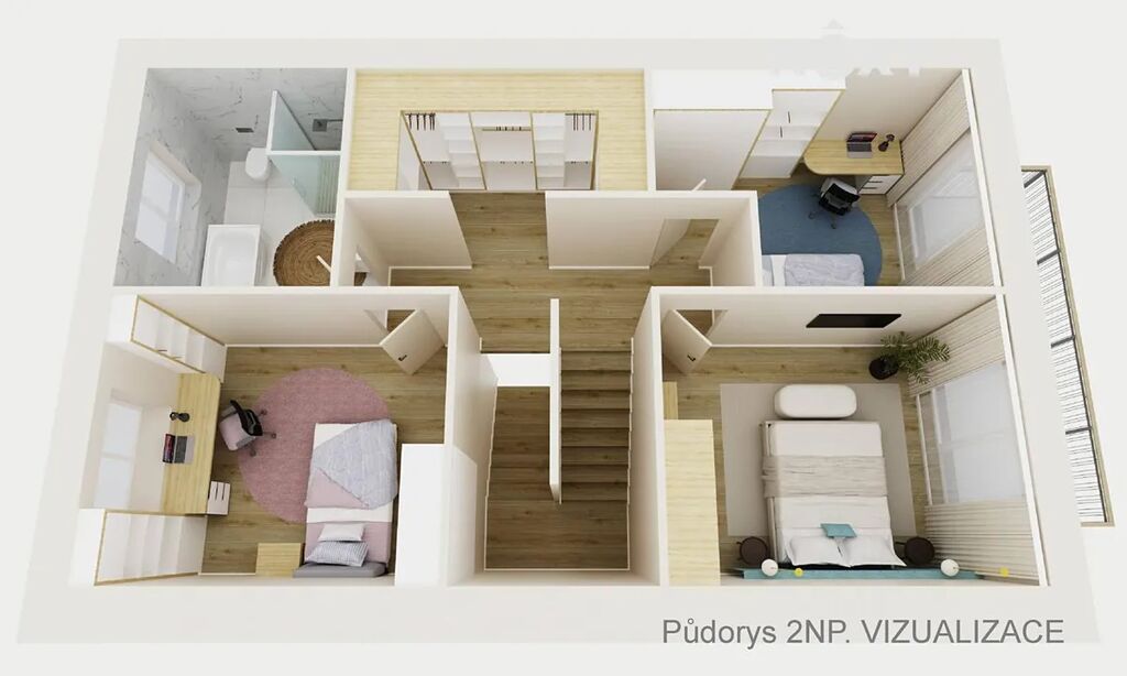 V patře se nachází chodba (6,23 m²), šatna (7,02 m²), koupelna (8,13 m²), ložnice (14,50 m²), pokoj (16,63 m²) a pokoj (14,85 m²). Všechny pokoje v horním patře mají francouzská okna se vstupem na terasu a krásným výhledem do lesa.