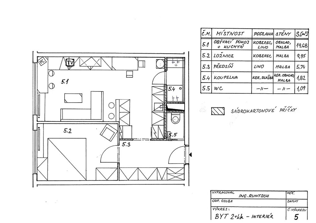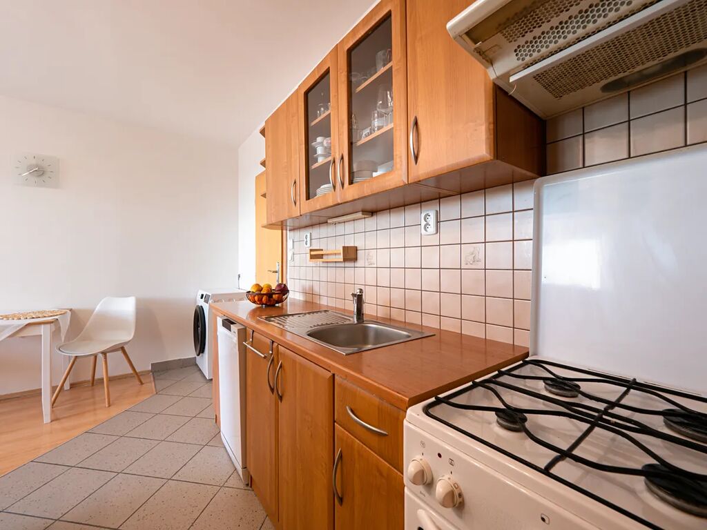 Bytové jádro bytu je vyzděné, koupelna se sprchovým koutem, předsíň, samostatným WC, ložnicí a obývacím pokojem s kuchyňským koutem, lednice, pračka, myčka a vestavná skříń v předsíni. Před bytem se nachází uzamykatelná komora, která náleží k bytové jednotce.