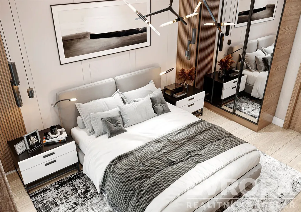 Interiér obývacího pokoje působí vzdušně a společně i s loznicí příjemně díky světlým tónům. Kvalitní materiály a chytré dispozičnímu řešení dává bytu pocit prostornosti.