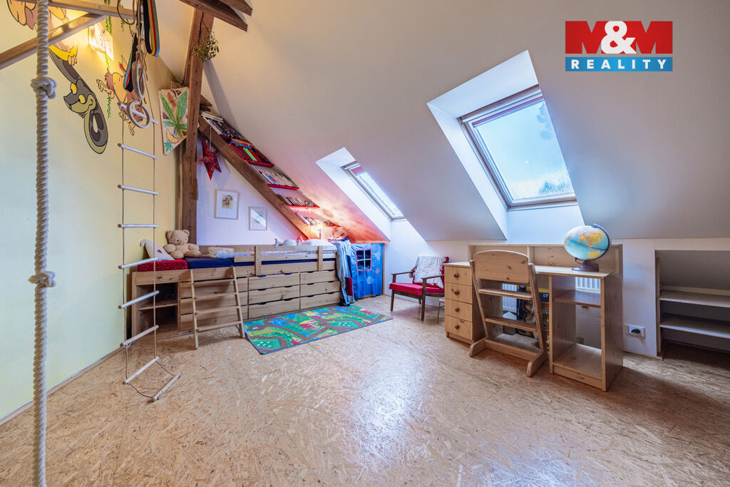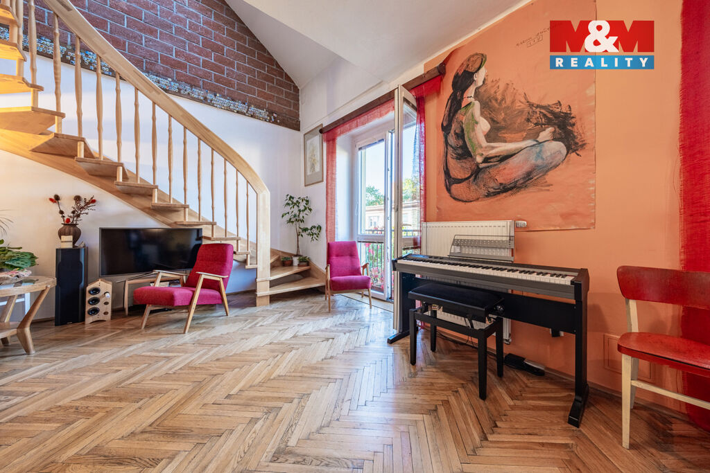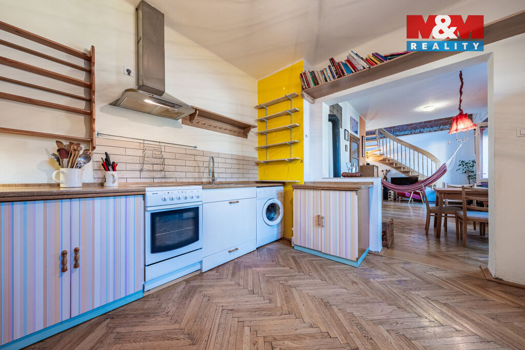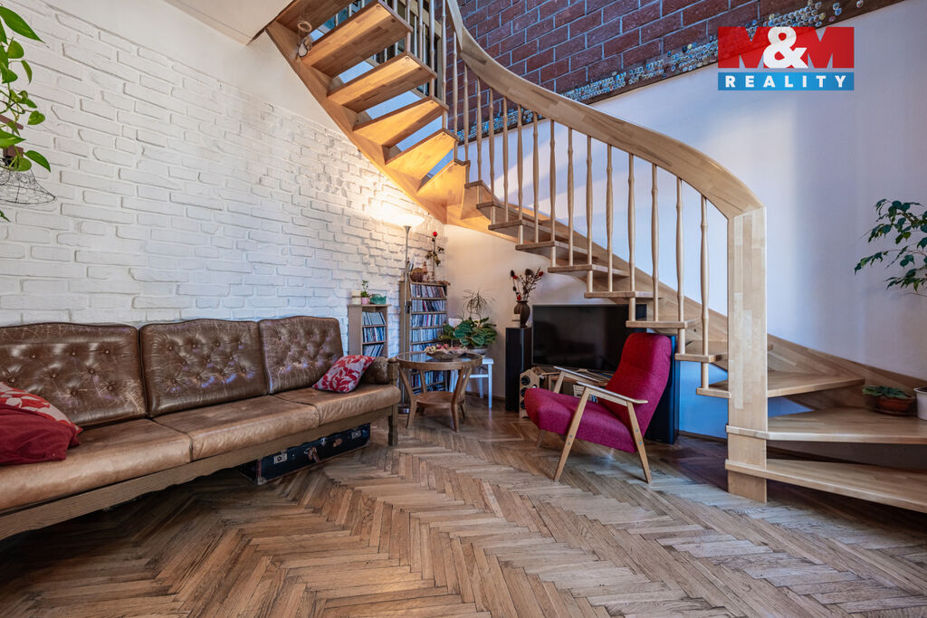 Ve spodním podlaží Vás přivítá předsíň a prosluněný obytný pokoj se stylovými kamny. Otevřený průhled do patra dodává bytu vzdušnost; na druhém konci je velká kuchyně s pracovním koutem. Všude masivní dřevěné parkety, z předsíně vstup do koupelny s vanou a WC. Po dřevěném schodišti vystoupáte na galerii s knihovnou. Napravo je dětský pokoj, nalevo samostatné WC, dále světlá ložnice a za ní prostorná šatna.