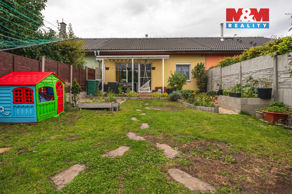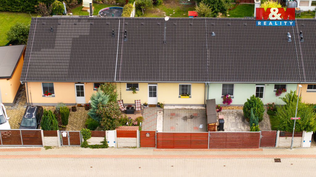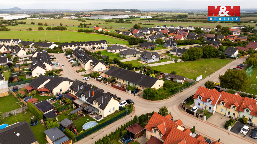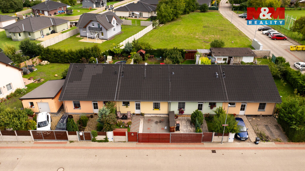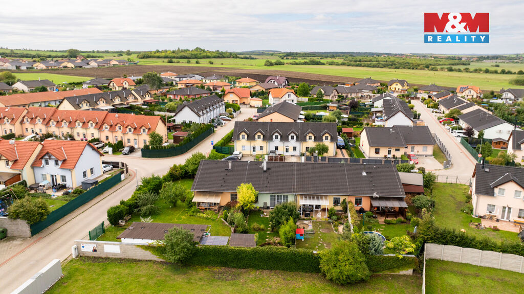 Nabízíme k prodeji novostavbu řadového rodinného domu o dispozici 3+kk, s užitnou plochou 91 m², nacházející se na slunném pozemku o celkové výměře 266 m² v klidné části obce Postřižín, okres Praha-východ. Dům je vybudován z kvalitní cihlové konstrukce a nabízí moderní a komfortní bydlení. Hlavním prostorem je prostorný obývací pokoj s kuchyňským koutem a jídelní částí, ze kterého je přístup na terasu s pergolou. Dále jsou zde dvě ložnice, koupelna s vanou a sprchovým koutem a samostatná toaleta. Technické zázemí zahrnuje technickou místnost, kde je umístěný el. bojler, půdní prostor a zahradní domek. Vytápění zajišťují elektrické panely, okna mají venkovní elektrické rolety. K dispozici klimatizace. Lokalita nabízí veškerou občanskou vybavenost a skvělou dostupnost do Prahy.