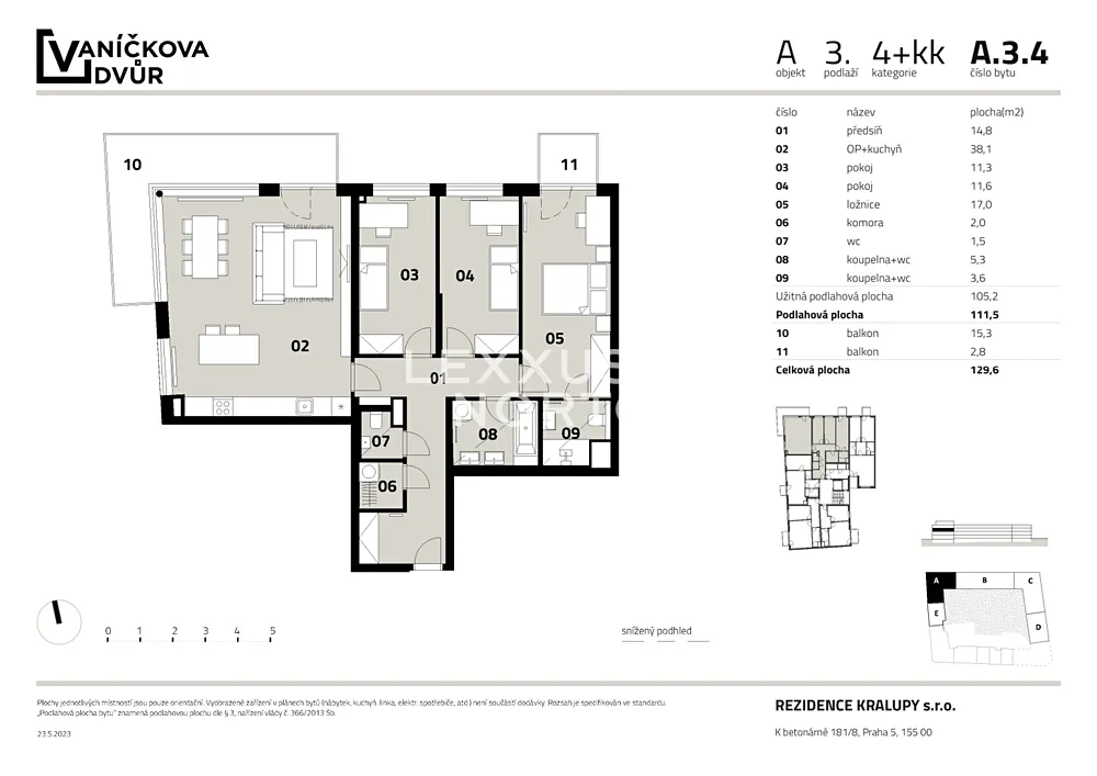 Moderní projekt Vaníčkova Dvůr vám nabízí k prodeji velkoryse řešený byt s dispozicí 4+kk o rozměrech 111,5 m² s balkony 2,8 m² a 15,3 m². Byt se nachází ve 4. podlaží v nově vznikajícím projektu Vaníčkova Dvůr v srdci Kralup nad Vltavou.