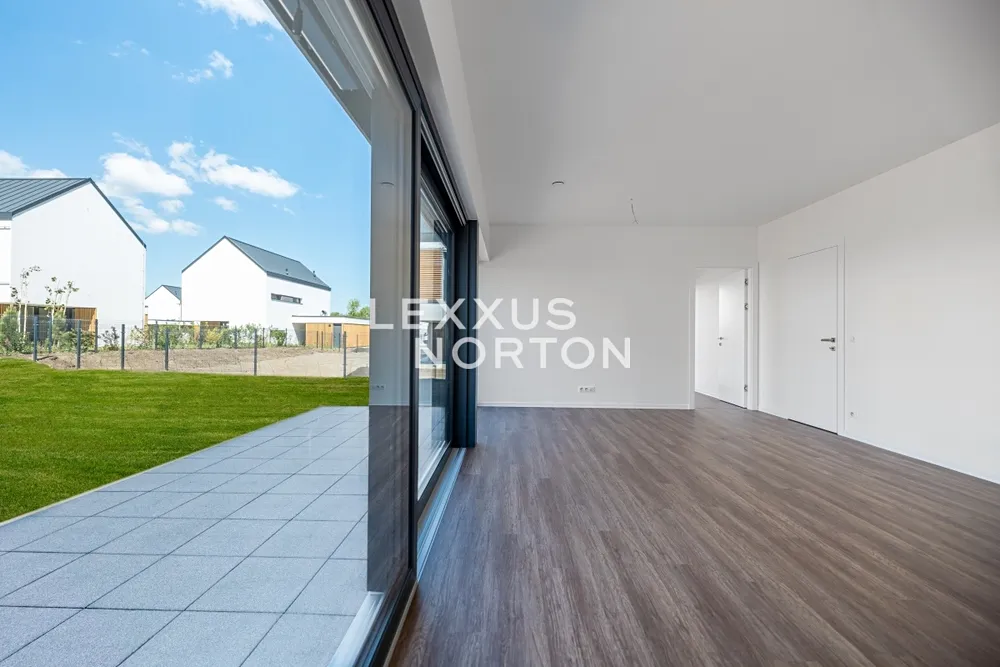 V domě je použita kvalitní sanita značky LAUFEN, která vyniká moderním designem a dlouhou životností. Vanové baterie a sprchový set HANSGROHE dodávají koupelnám prémiový vzhled a maximální komfort. Pro zvýšení energetické úspornosti jsou instalována okna s izolačními trojskly, která zajišťují vynikající tepelnou a zvukovou izolaci. Vinylové podlahy s akustickou podložkou dále přispívají ke klidnému a pohodlnému bydlení.