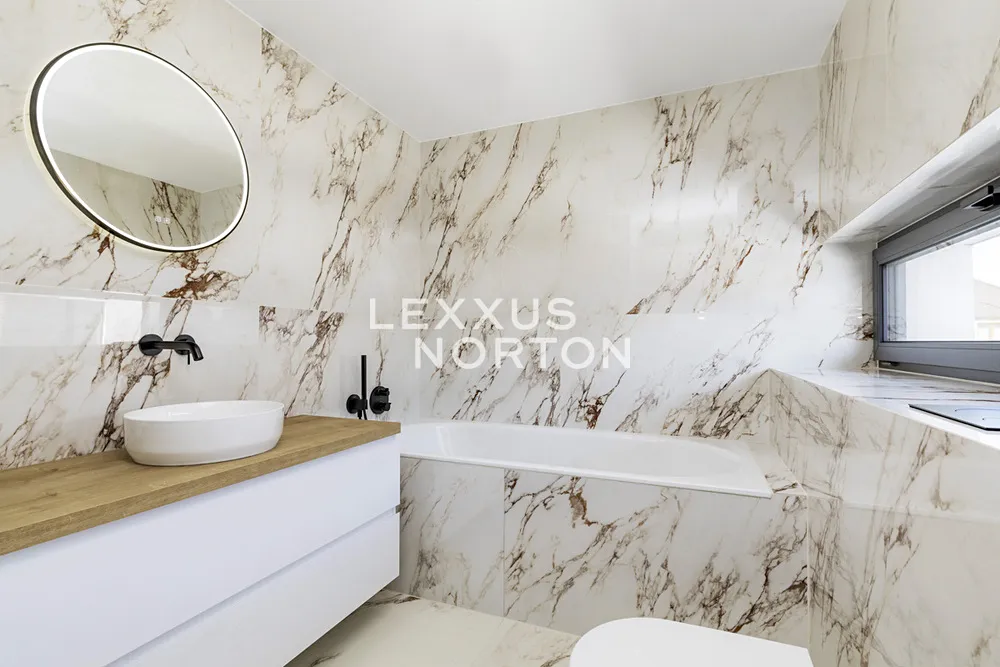 V celém domě je použita kvalitní sanita značky GROHE, která vyniká moderním designem a dlouhou životností. Vanové baterie a sprchový set HANSGROHE dodávají koupelnám prémiový vzhled a zajišťují maximální komfort. Koupelny jsou navíc obloženy velkoformátovými obklady, které podtrhují luxusní vzhled interiéru. Vysoký standart bydlení podtrhuje kvalitní dvouvrstvá dřevěná podlaha. Pro zvýšení energetické úspornosti jsou instalována okna s izolačními trojskly, která zajišťují vynikající tepelnou a zvukovou izolaci.