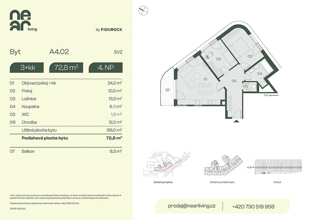 Nabízíme k prodeji byt 3+kk o podlahové ploše 72,8 m² s balkonem 6,3 m² v developerském projektu NEAR living v Praze 8, vznikajícím na pomezí Palmovky a Karlína.