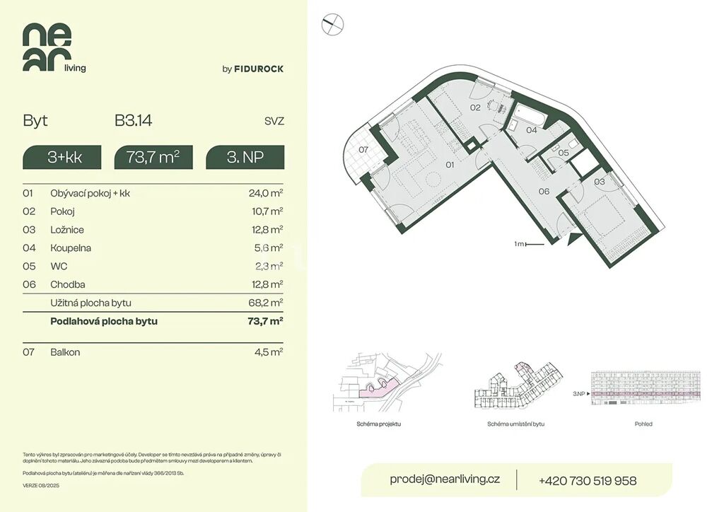 Nabízíme k prodeji byt 3+kk o podlahové ploše 73,7 m² s balkonem 4,5 m² v developerském projektu NEAR living v Praze 8, vznikajícím na pomezí Palmovky a Karlína.