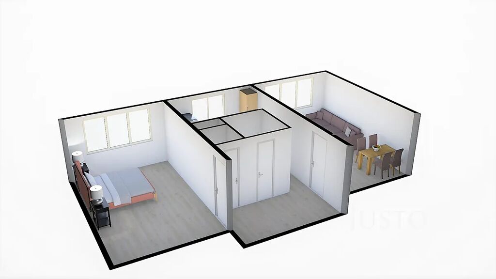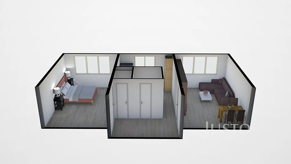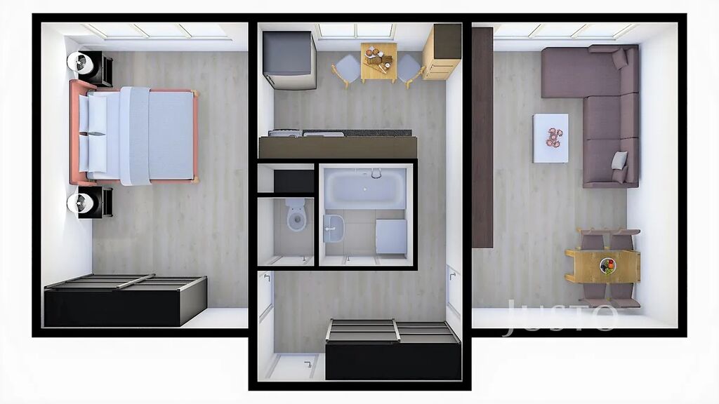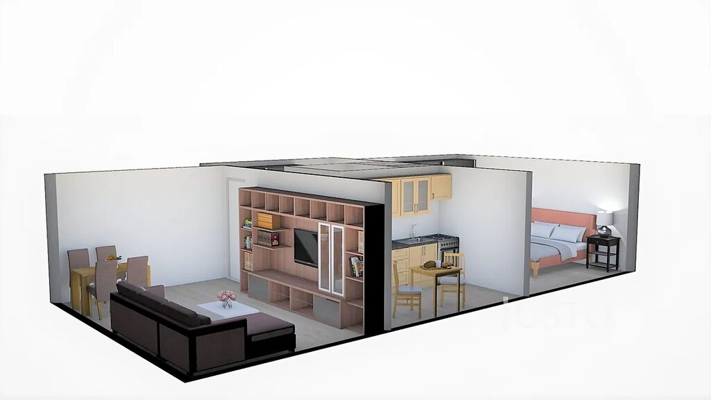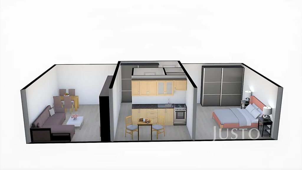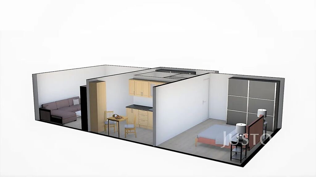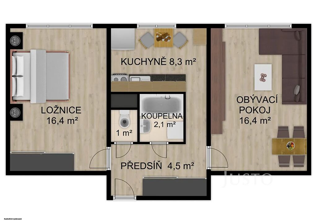 Při vstupu do bytu je předsíň o výměře 4,5 m², odtud je vstup na WC a do samostatné koupelny. V kuchyni o výměře 8,30 m² je nová kuchyňská linka. Obývací pokoj a ložnice mají stejnou výměru a to 16,40 m². Byt bude vybaven jen kuchyňskou linkou a gaučem.