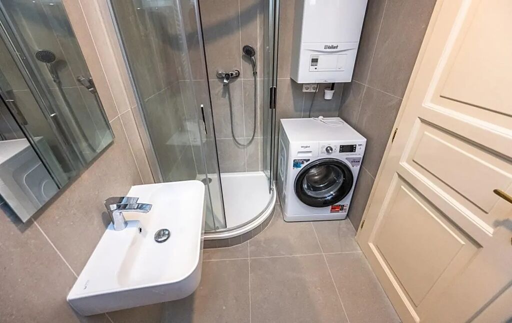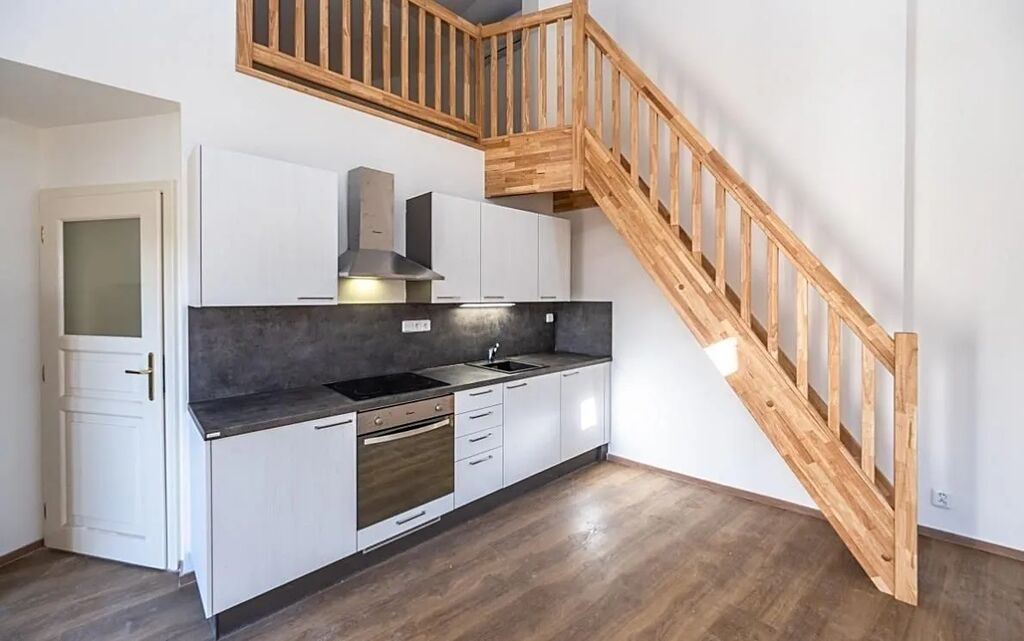 Interiér bytu je nezařízený a dispozičně nabízí vstupní předsíň, klimatizovaný prostorný pokoj propojený s kuchyní a se vstupem na galerií, kterou lze využít jako spací patro, dále moderní koupelnu se sprchovým koutem, pračkou a toaletou. Kuchyň je vybavená kuchyňskou linkou včetně spotřebičů: digestoř, myčka, lednice s mrazákem, varná deska a elektrická trouba. Vytápění a ohřev vody je zajištěn v samostatným novým plynovým kotlem zn. Vaillant. Ve dvorním traktu bude vybudováno pro nájemníky malé zázemí s možností posezení u kávy nebo grilování.