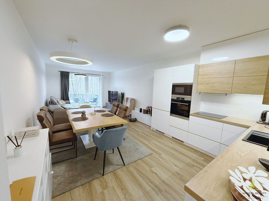 Dispozice 3+kk zahrnuje prostorný a prosvětlený obývací pokoj s přístupem na balkon s nádherným výhledem do zeleně. Dominantou obývacího prostoru je luxusní polohovatelná sedací souprava, která zajišťuje maximální pohodlí. Součástí je plně vybavený kuchyňský kout s moderními spotřebiči. Ložnice i dětský pokoj jsou orientovány do tichého vnitrobloku, kde se přímo pod okny nachází soukromé dětské hřiště – ideální pro rodinu s malým dítětem.