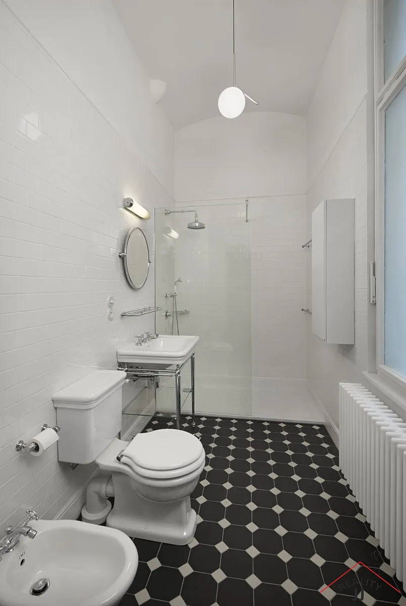 Další dva další pokoje, každý s vlastní koupelnou, směřují do klidného vnitrobloku. Jeden je zařízen jako hlavní ložnice, druhý je možno využít jako pracovnu, pokoj pro hosty nebo dětský pokoj.